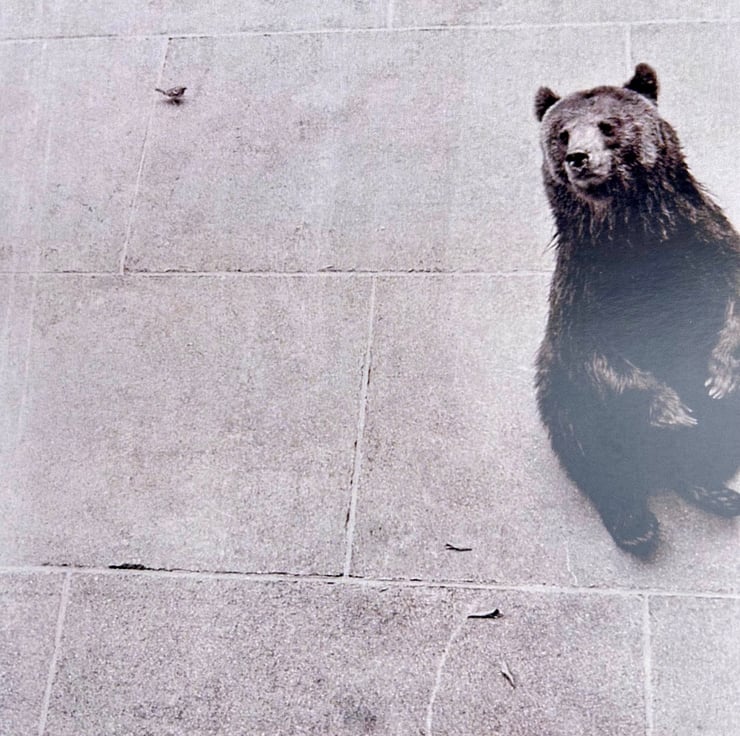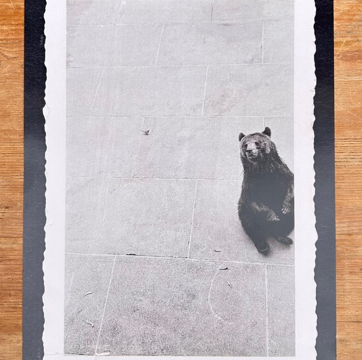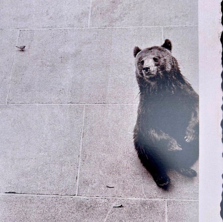 Print of a vintage photo of a Bear and small bird. Taken in Berne in 1951. Titled 'La cage aux ours'. This holiday memory was found in a flea market in Belgium.