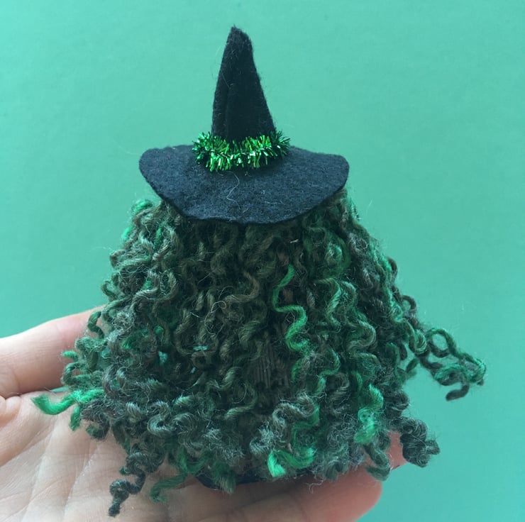 She has curly wool hair, a felt witch hat, and little broomstick.