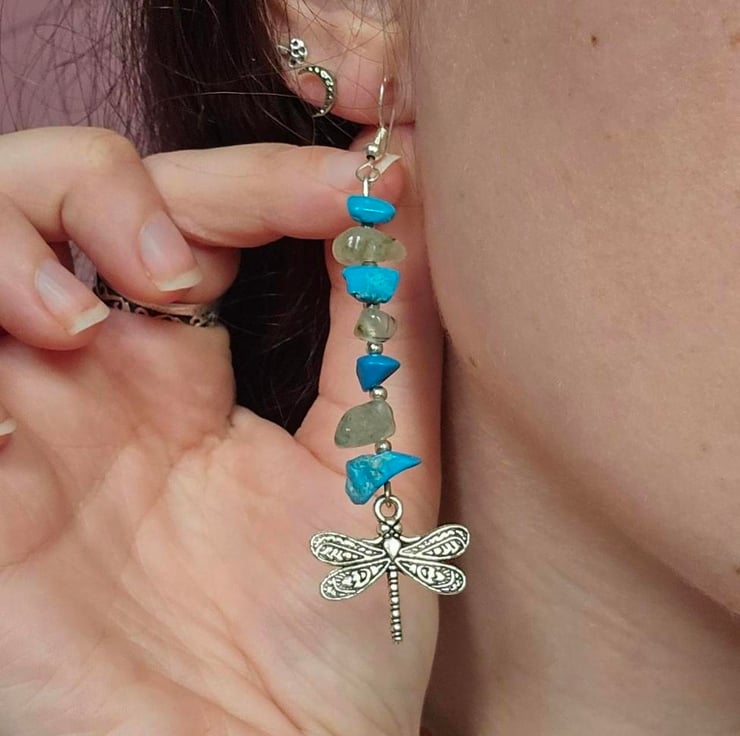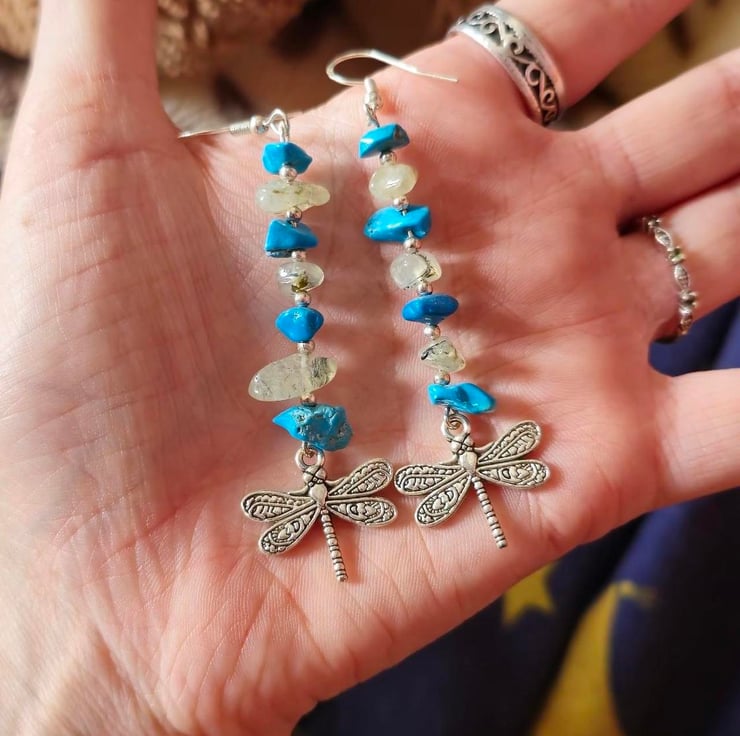 Handmade earrings with prehnite and howlite gem stones and dragonfly charms