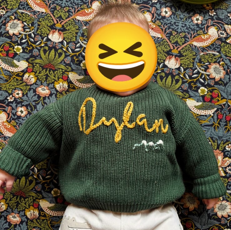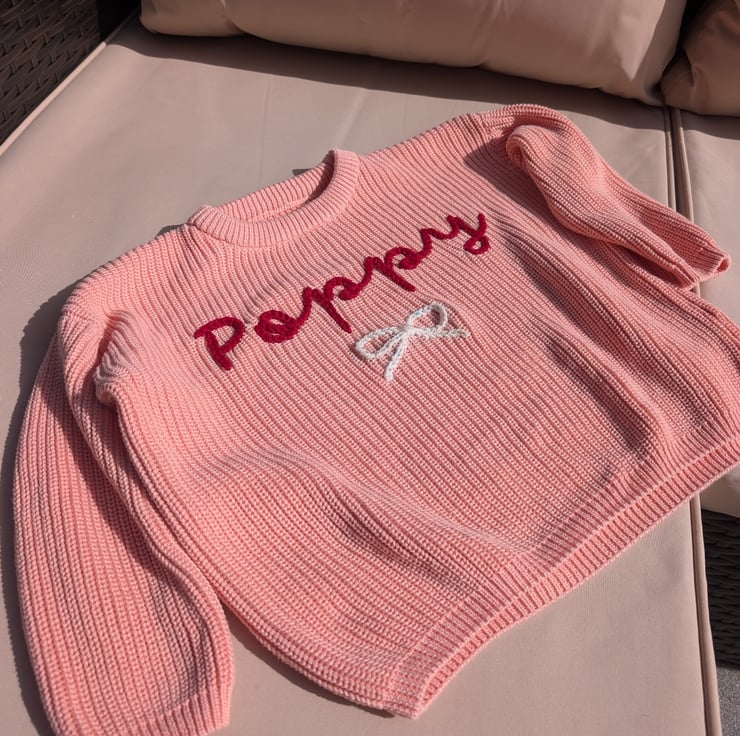 Each jumper is customised with a name in soft, hand-shaped yarn lettering, creating a one-of-a-kind piece that's as special as the person wearing it.