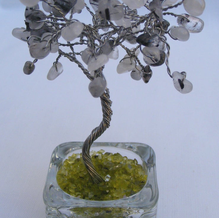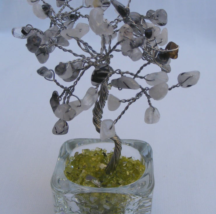 I've handmade this lovely gemstone tree with a 5x5 cm square glass holder, silver plated copper wire, natural rutilated quartz pebbles, and green glass chippings. A lovely gift to display in the home.
