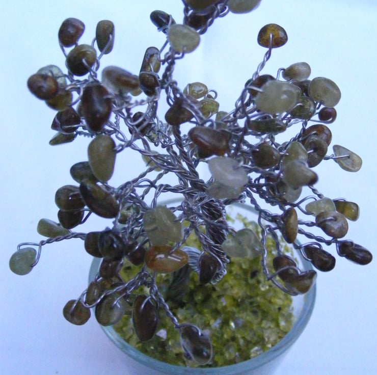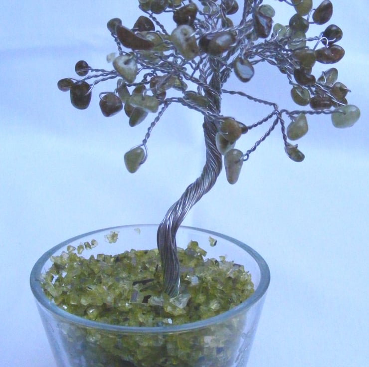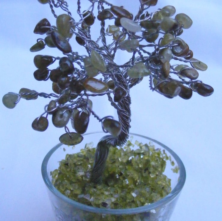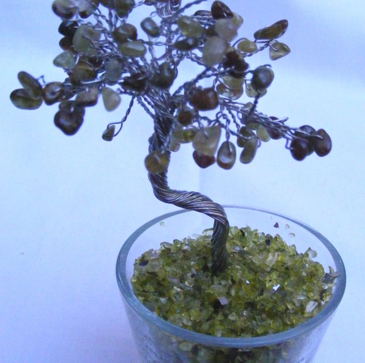 A beautiful, handmade gemstone tree, made using, green garnet nuggets, silver plated wire, 7cm round dish and glass chippings. A lovely gift for the home or a loved one.