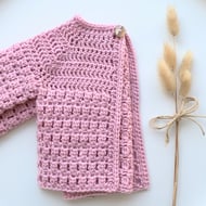 I just love this little pixie hat so much with its cute little bobbles dotted all over. The bonnet is hand crocheted my me using 100% merino wool. It features a stretchy ribbed edging to frame baby's face and can be tied gently underneath their chin.