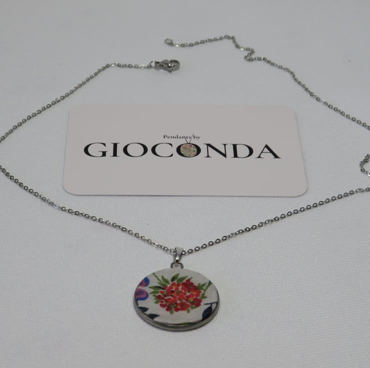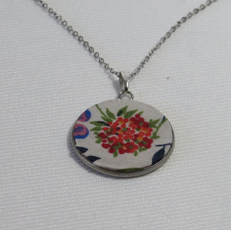 Pendant Necklace is made using quality Liberty Fabric, which is set in a 25mm Stainless Steel Bezel and hangs on a 45cm Stainless Steel Chain and fastening.