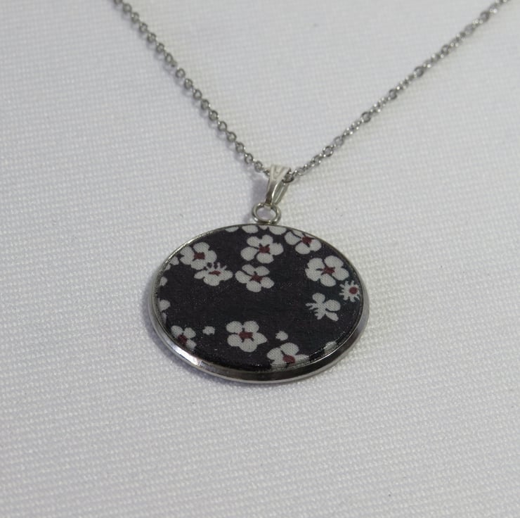 Pendant Necklace is made using quality Liberty Fabric, which is set in a 25mm Stainless Steel Bezel and hangs on a 45cm Stainless Steel Chain and fastening.