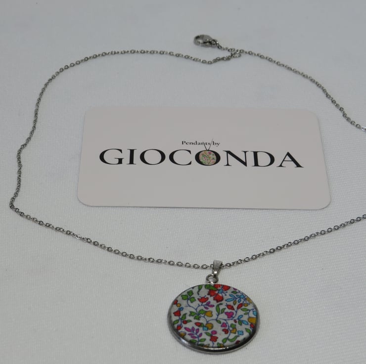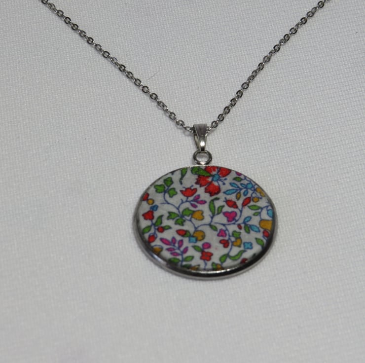 Pendant Necklace is made using quality Liberty Fabric, which is set in a 25mm Stainless Steel Bezel and hangs on a 45cm Stainless Steel Chain and fastening.