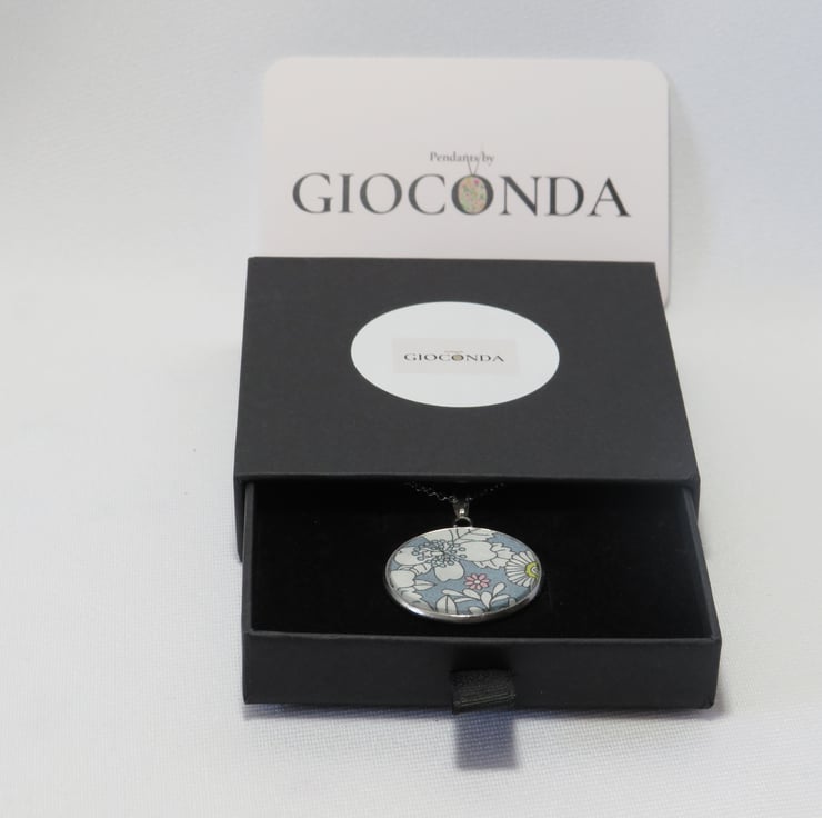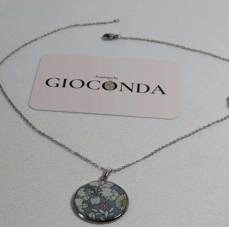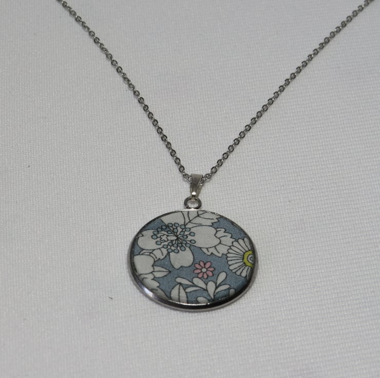 Pendant Necklace is made using quality Liberty Fabric, which is set in a 25mm Stainless Steel Bezel and hangs on a 45cm Stainless Steel Chain and fastening.