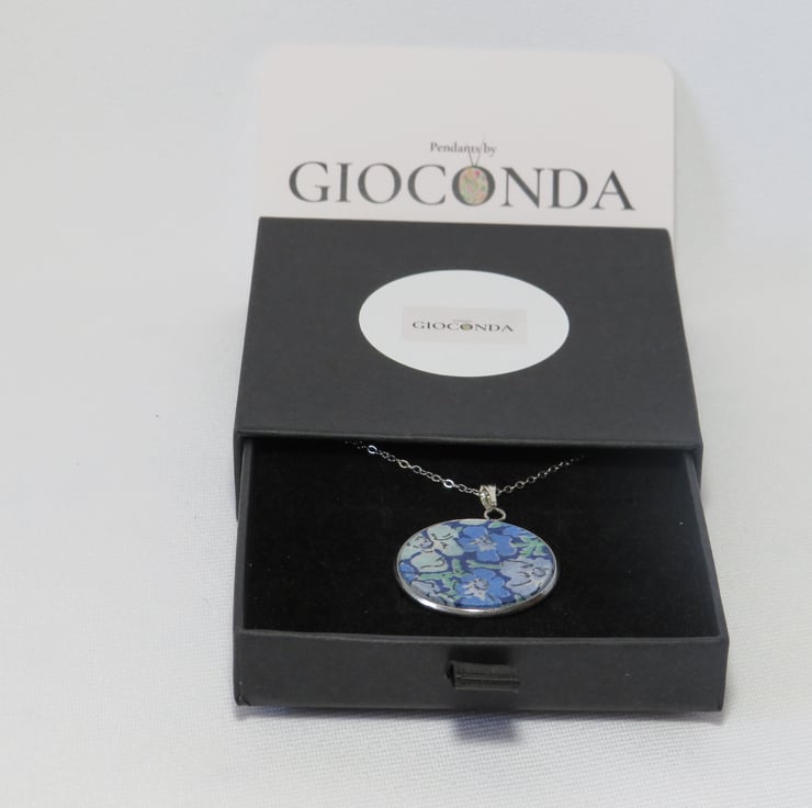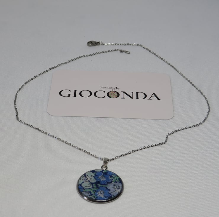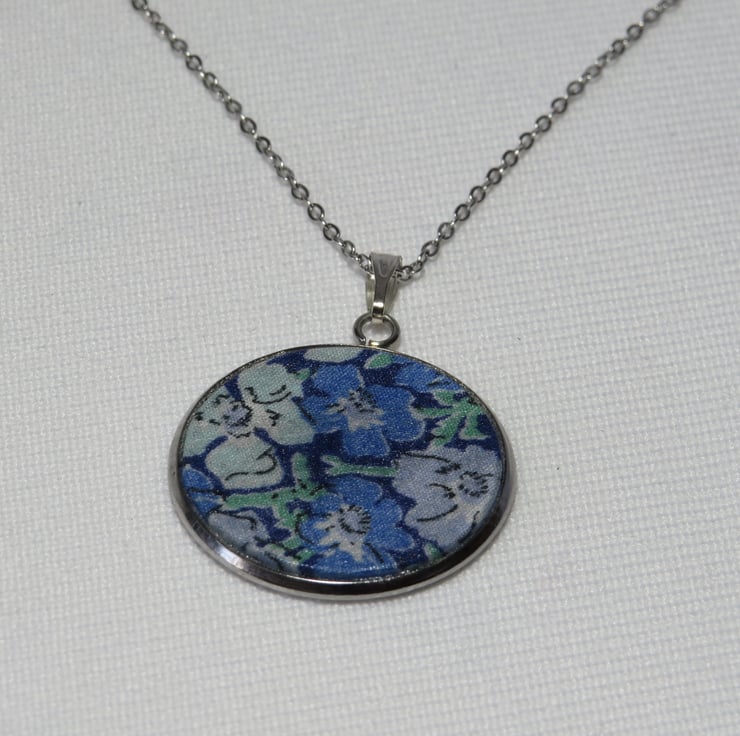 Pendant Necklace is made using quality Liberty Fabric, which is set in a 25mm Stainless Steel Bezel and hangs on a 45cm Stainless Steel Chain and fastening.