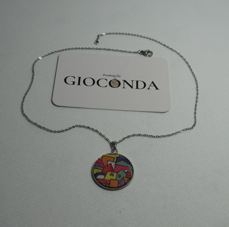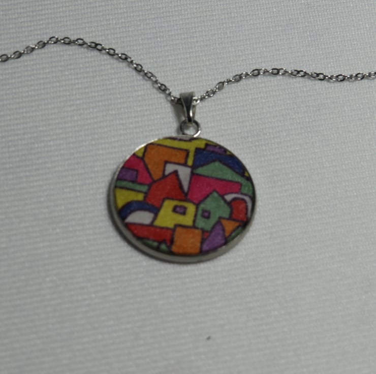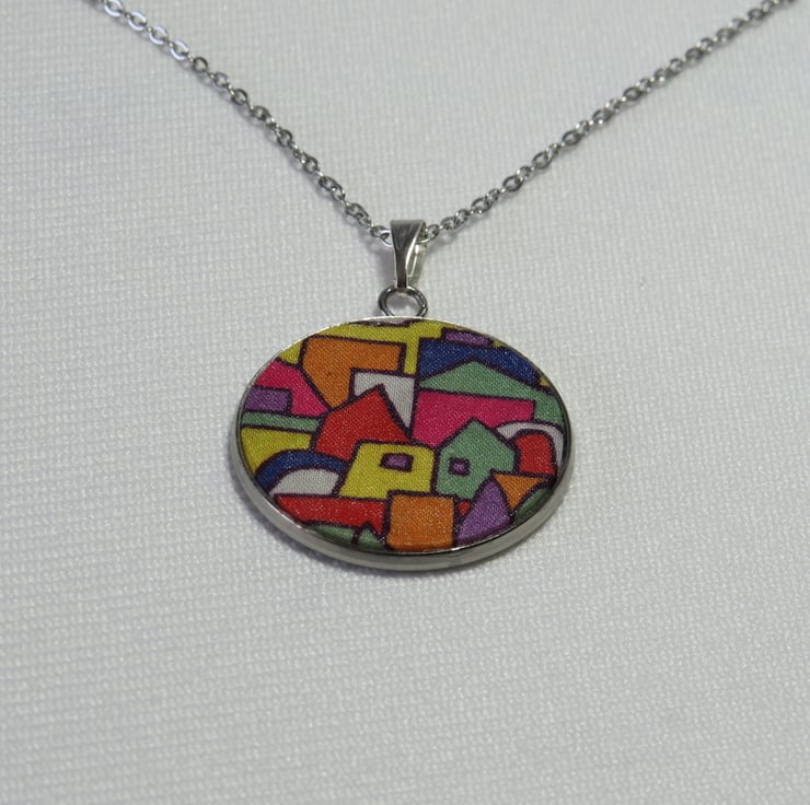 Pretty Coloured Houses Liberty Fabric Pendant Necklace with Stainless Steel Chain