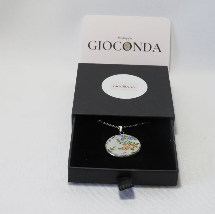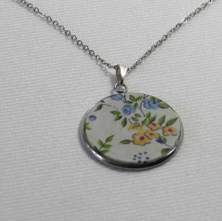 Pendant Necklace is made using quality Liberty Fabric, which is set in a 25mm Stainless Steel Bezel and hangs on a 45cm Stainless Steel Chain and fastening.
