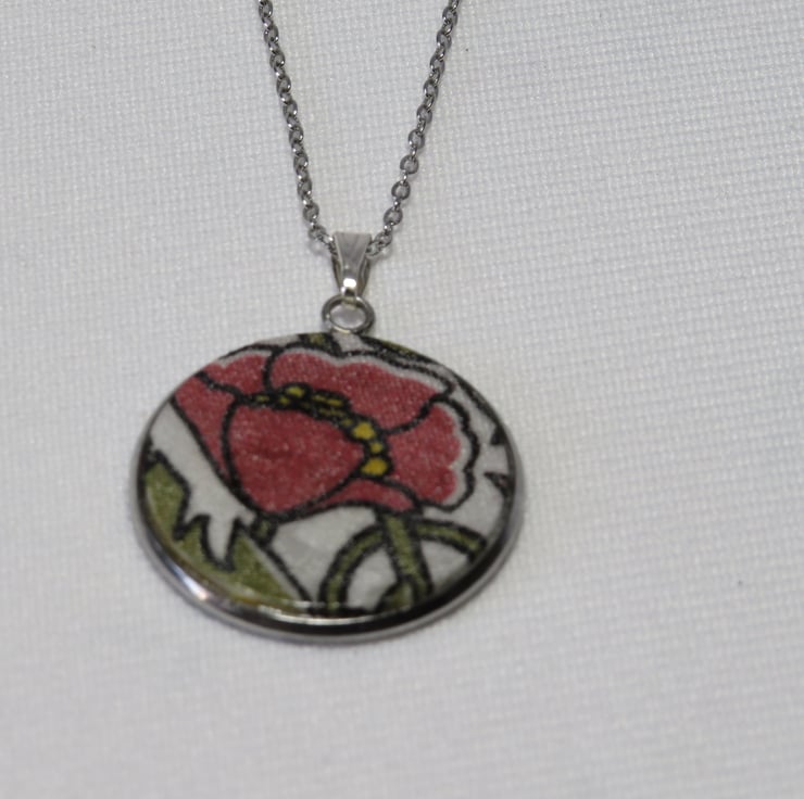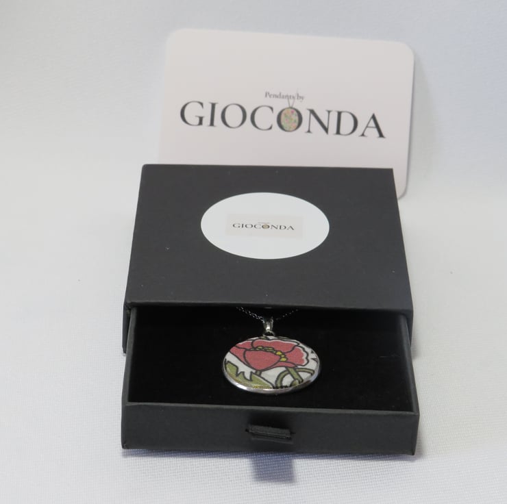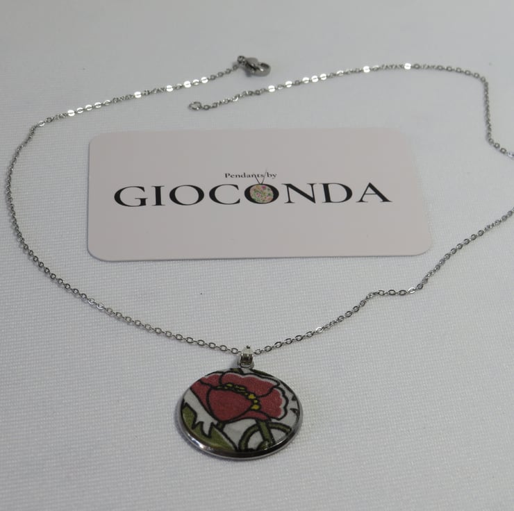 Pendant Necklace is made using quality Liberty Fabric, which is set in a 25mm Stainless Steel Bezel and hangs on a 45cm Stainless Steel Chain and fastening.