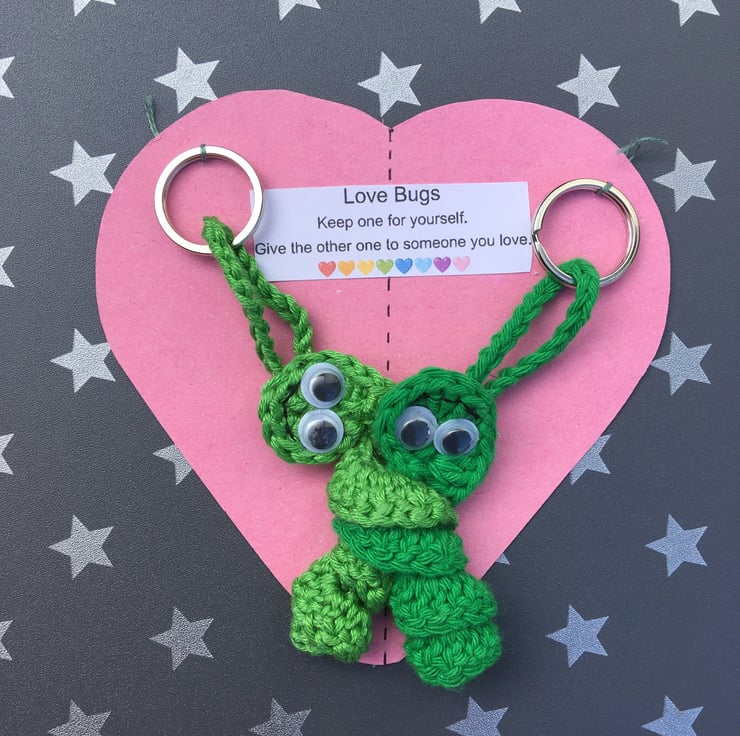 There are two little crochet bugs. They can be separate pieces, or twirled together to form one. They would be the perfect friendship gift, or Valentines gift, or anniversary gift, or Mothers/ Fathers day gift.