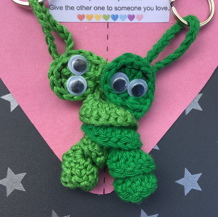 They are crochet and have googly eyes and a smiley face. Each one is attached to a keyring.