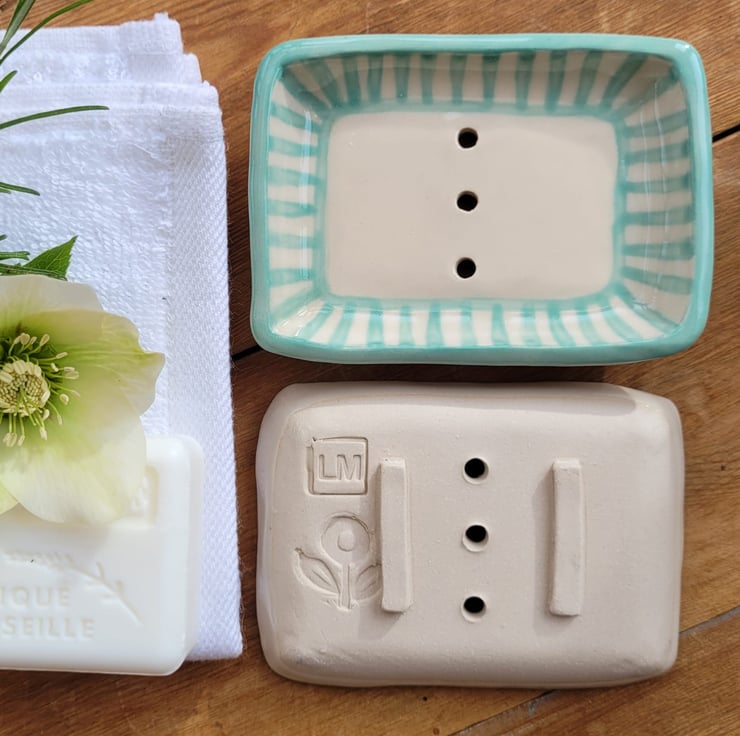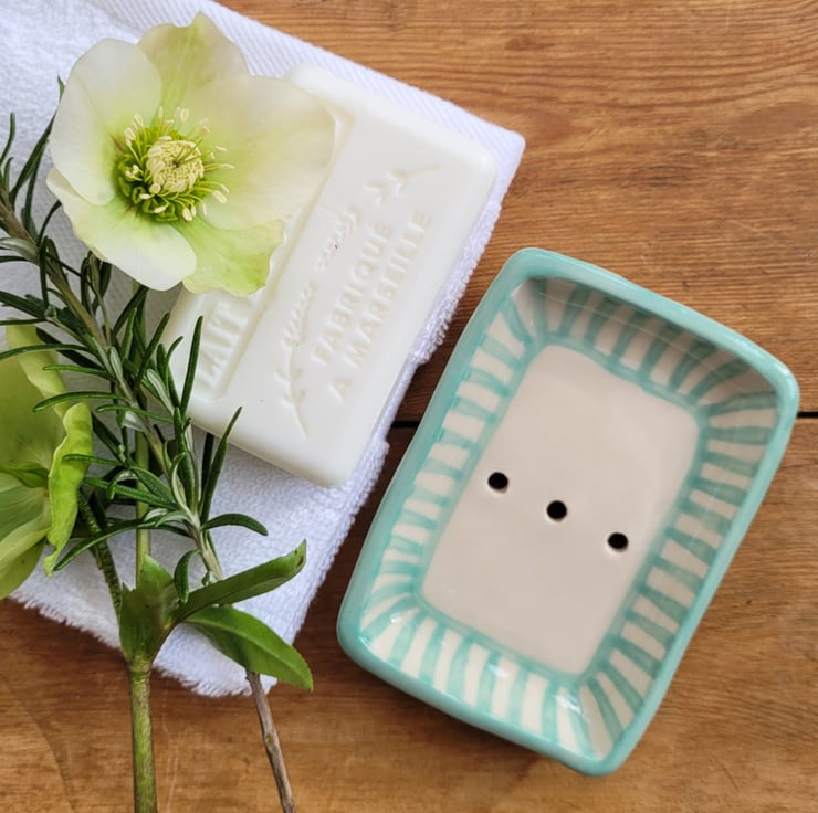 Pretty little soap dish with a turquoise striped edge.