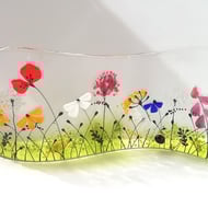 This is great fun, a fused glass fish that wobbles as if swimming. He's full of deep blue bubbles and I've created the lettering by a technique called "sgraffito" allowing the bubbles to be seen through the lettering. I've handcut the glass and used copper oxide for the bubbles that are trapped inside him. When mounting him I coiled the wire which allows him to rock as if swimming. The lettering says "just keep swimming" . He stands on a log slice and is perfect on a windowsill.