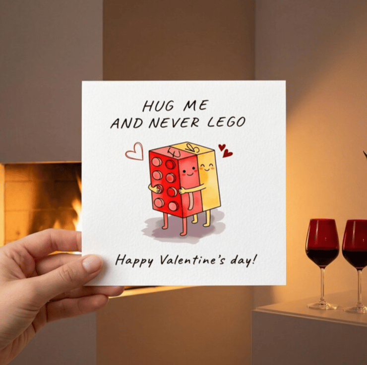 This card feels warm, playful, combining gentle humour with a handmade charm that immediately makes it likable and giftable. The hand-drawn characters, limited warm colour palette, and visible paper texture create a sense of authenticity and care, while the LEGO-inspired hug adds nostalgia and comfort.