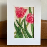 A hand felted Lily artwork crafted from merino wool. This unique textile piece captures the delicate features and colours seen in the British summer garden, using the needle felting technique. The flower is ‘painted’ with wool, felted onto a natural base with added details to bring out the flowers characteristics. Every piece is completely handmade and unique, making it a beautiful original gift for nature lovers, gardeners or anyone who loves the soft texture and warmth of textile art.