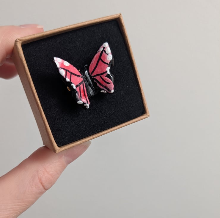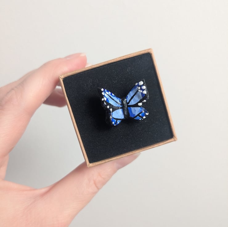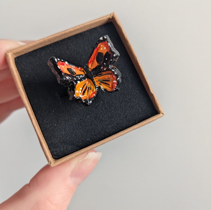 This lovely handcrafted butterfly has been made from air dry clay, hand painted and varnished, it is attached to a adjustable ring made from iron, the ring fits most sizes as it is adjustable, it's size before adjusting is 1.8cm. The blue butterfly has a silver colour ring, orange has a bronze colour ring and pink has a gold colour iron ring.