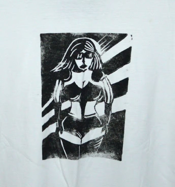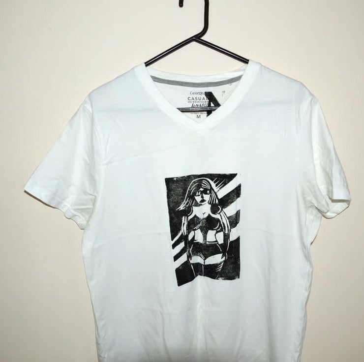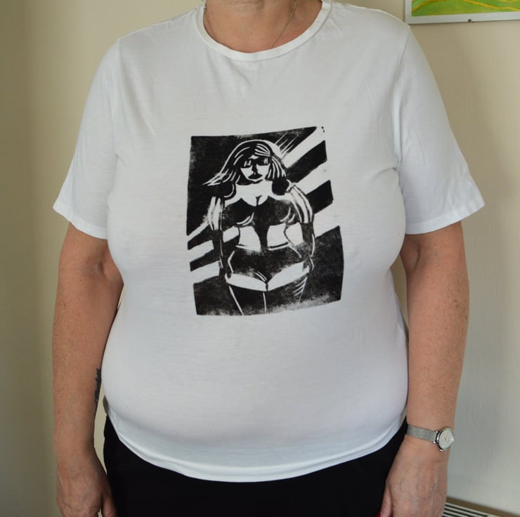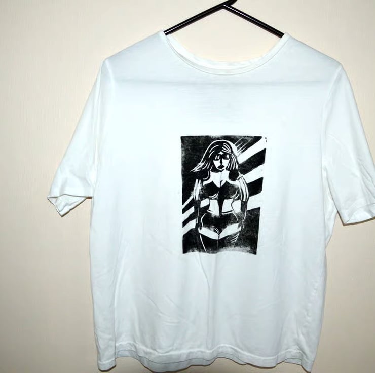 This is an upcycled T shirt the design is based around Maria from the iconic 1927 sci-fi film Metropolis which I've also done a song on.