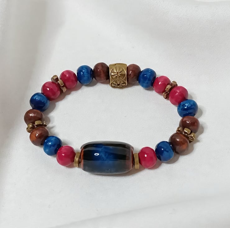 This vibrant Bohemian bracelet features an exquisite blend of colorful wooden beads, accented with bronze spacers, and highlighted by a high-fired ceramic tube bead as its stunning focal point.