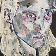 Layered collage, ink, and watercolour create a distressed, textured surface, with fragments of musical notation and text embedded into the figure, suggesting memory, performance, and inner narrative.