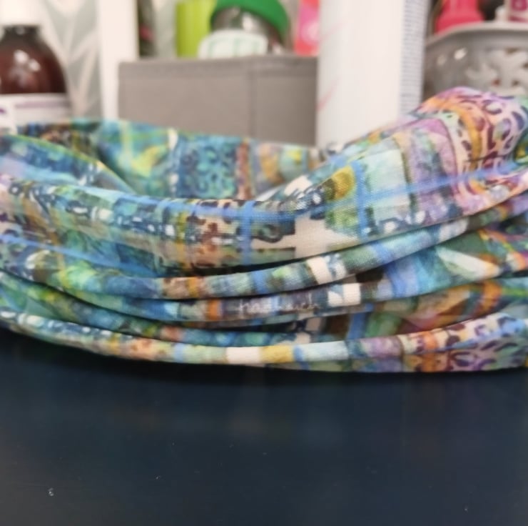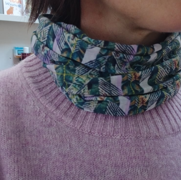 Love the idea of a mix of Scandinavian hygge and hebirdean magic. This cosy neck scarf is versatile enough to be worn all year round, especially in Scotland. Bright colours and hints of the flora and fauna of the islands and with a subtle tartan effect.