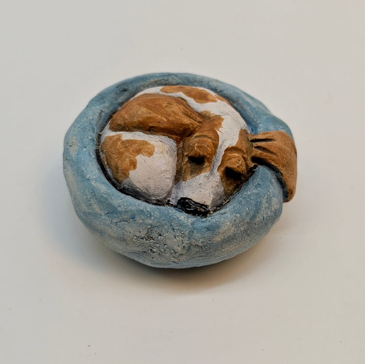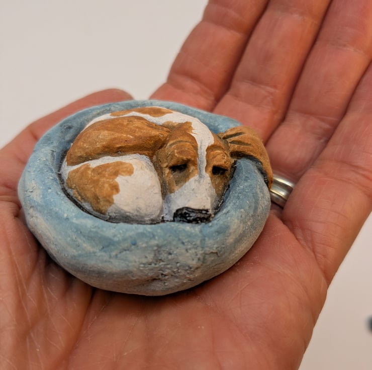 Miniature ceramic sculpture of a Basset Hound in a Yorkshire Pudding shaped bed!