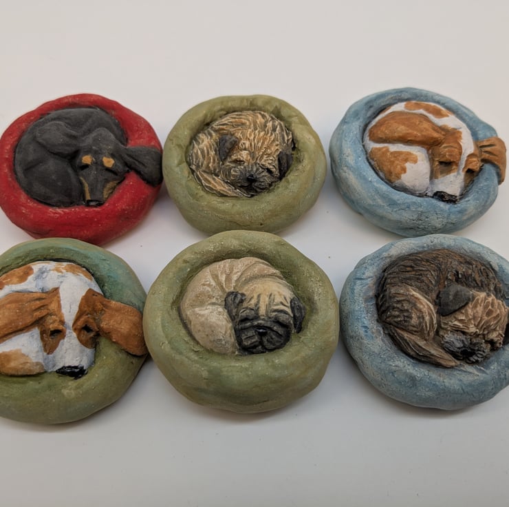 Miniature ceramic sculpture of a Basset Hound in a Yorkshire Pudding shaped bed!