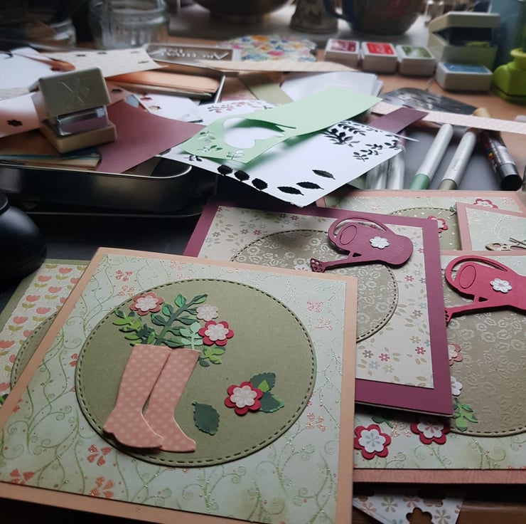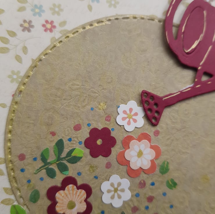 On the front panel, I included a dark red watering can that has small flowers and leaves falling out of its rose/sprinkler inviting all of us to slow down and enjoy a quiet moment in our gardens or any space where nature found a way to grow.
