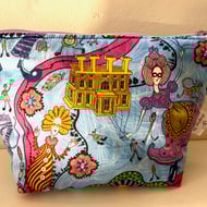 Zipped Accessory bag made with this beautiful Liberty of London Tana lawn cotton fabric. 'Prospect Road' depicts a colourful scene reminiscent of designs of the 1930s. Ideal storage for all your important bits and bobs. Lined with pink cotton fabric and closed with a ring zip pull - a really individual and eye-catching accessory.