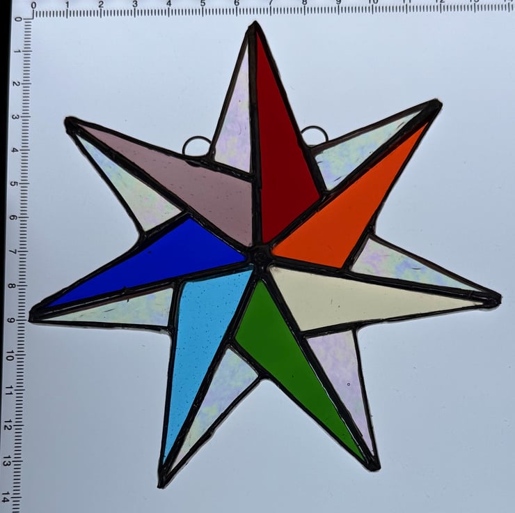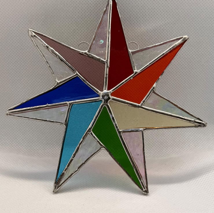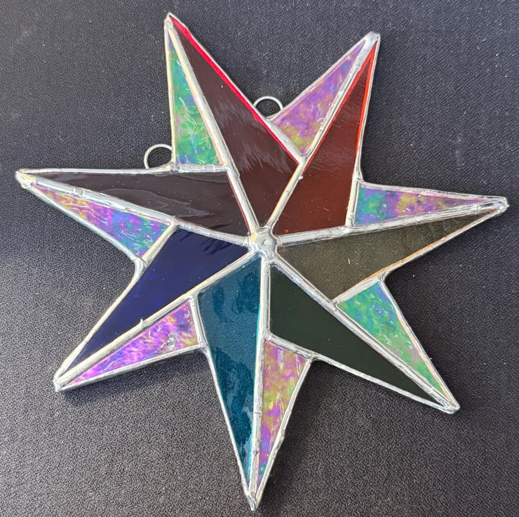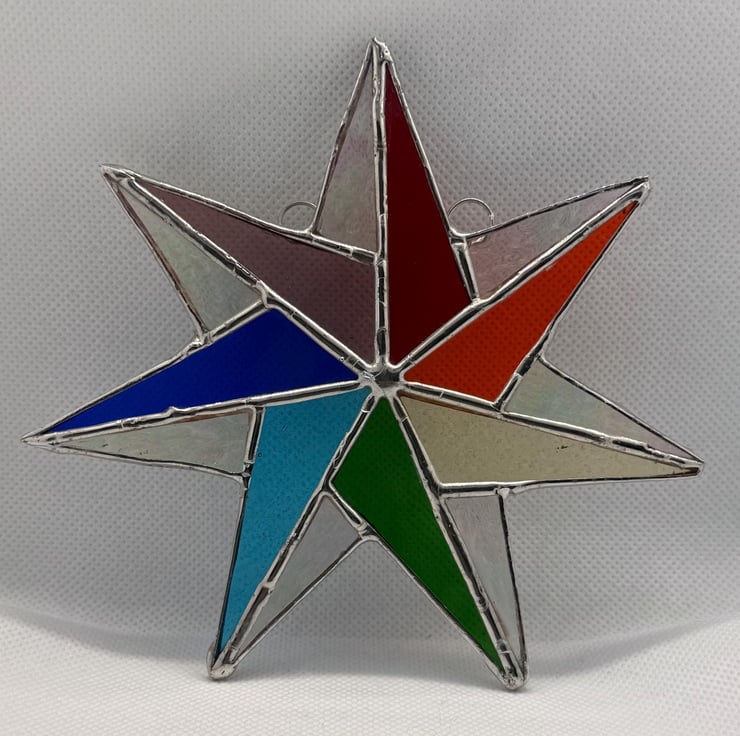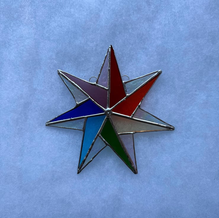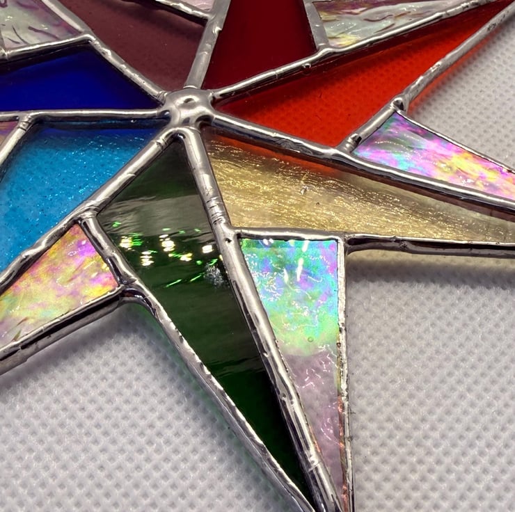 Each star is cut and shaped by hand using the traditional Tiffany foiled glass method. Every piece of glass is edged with copper foil, soldered, and cleaned. Craft glass naturally contains small variations and character marks which make every star unique, and the colours shown in the photographs have been captured as accurately as possible.