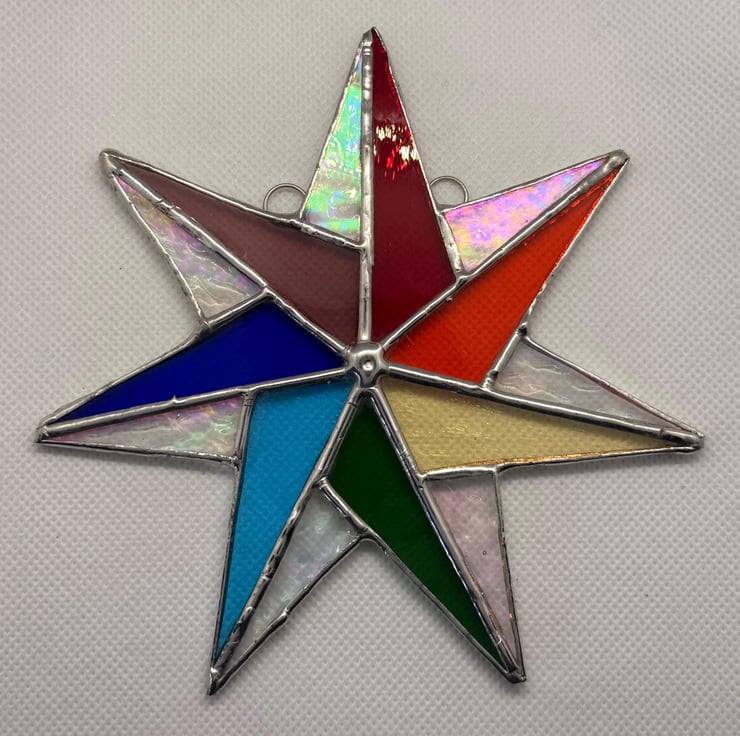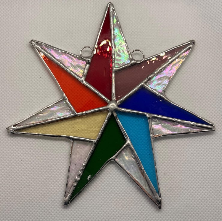 A hand crafted stained glass seven point rainbow star made from seven individual colour sections, each representing one of the rainbow hues, set alongside textured and iridescent clear glass. The combination creates a balanced, bright piece that shows strong colour when lit from behind and casts a vivid rainbow shadow when the light catches it.