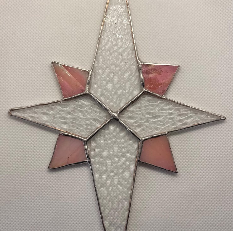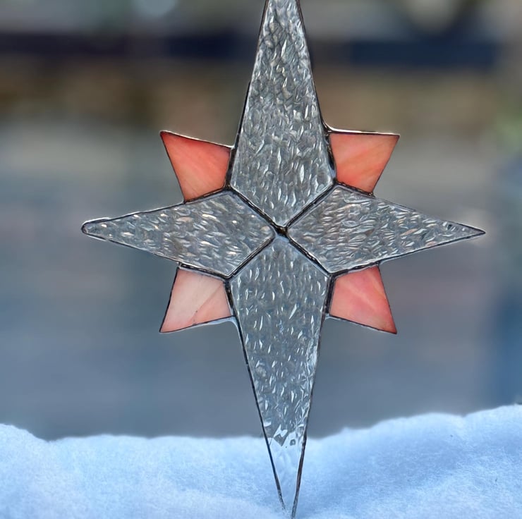 A hand crafted stained glass Bethlehem star made from clear hammered textured glass for the four main points and a rich sunset orange glass for the quarter points, giving the whole piece a warm glow that catches the light beautifully. A small hook is attached so it can hang from your Christmas tree, a festive garland, above your nativity scene or in a window as a suncatcher. Other colour combinations are available in separate listings.