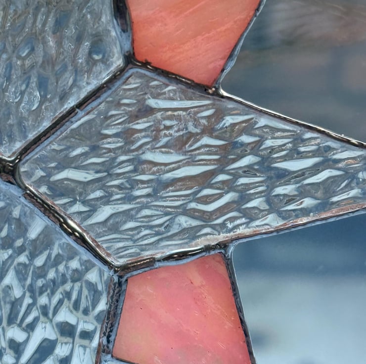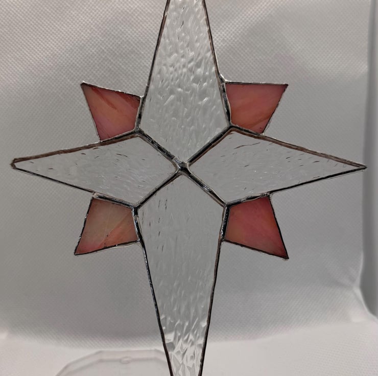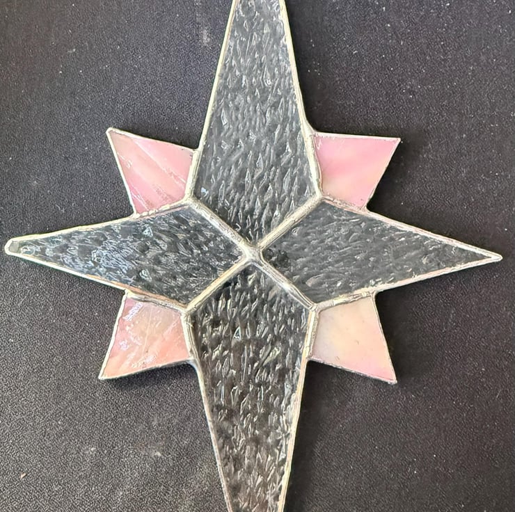 Every star is cut and shaped by hand using the traditional Tiffany foiled glass method. Each piece of glass is edged with copper foil, carefully soldered, cleaned and sometimes finished with patina to deepen the tones. Craft glass naturally contains small variations and character marks which make every star unique, and the colours shown in the photographs have been captured as faithfully as possible.
