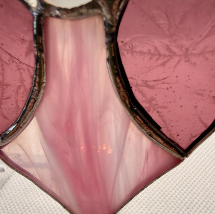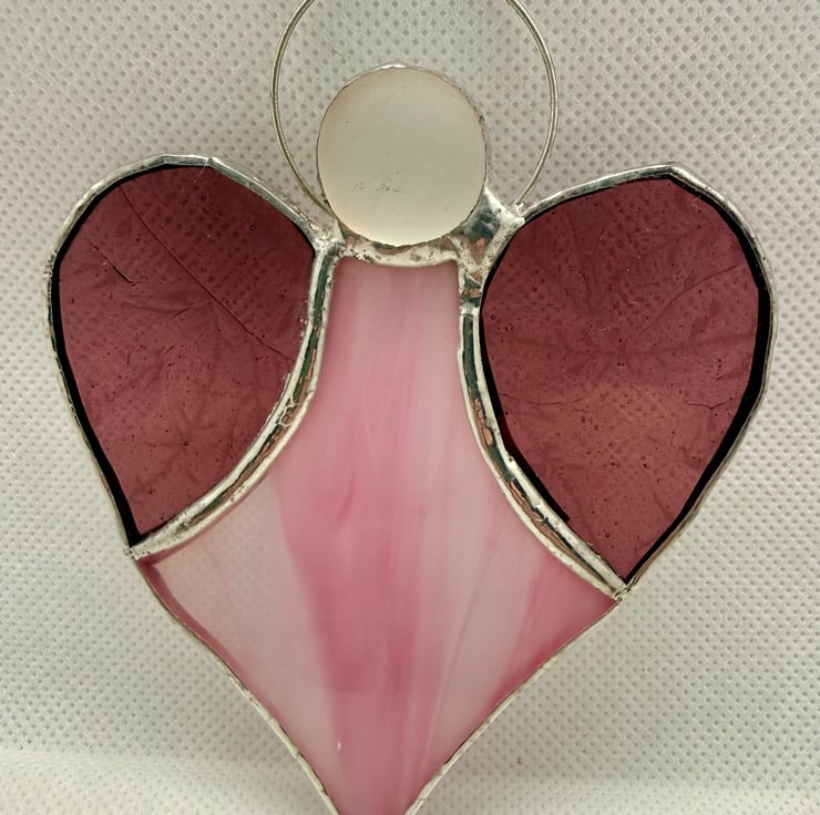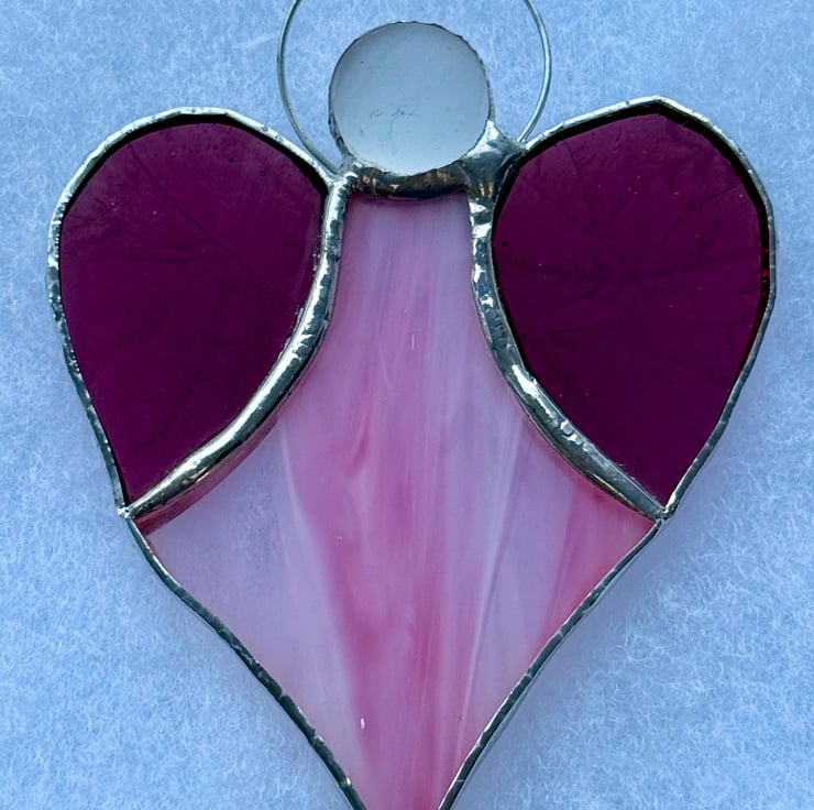A handcrafted stained glass heart angel made with richly coloured art glass for the body and clear hammered glass for the wings, topped with a coordinating glass bead head. The wings shimmer softly in the light, while the body glows with gentle warmth that shifts throughout the day.
