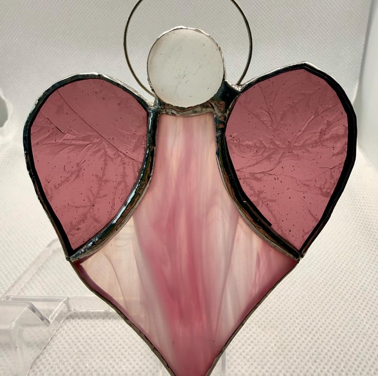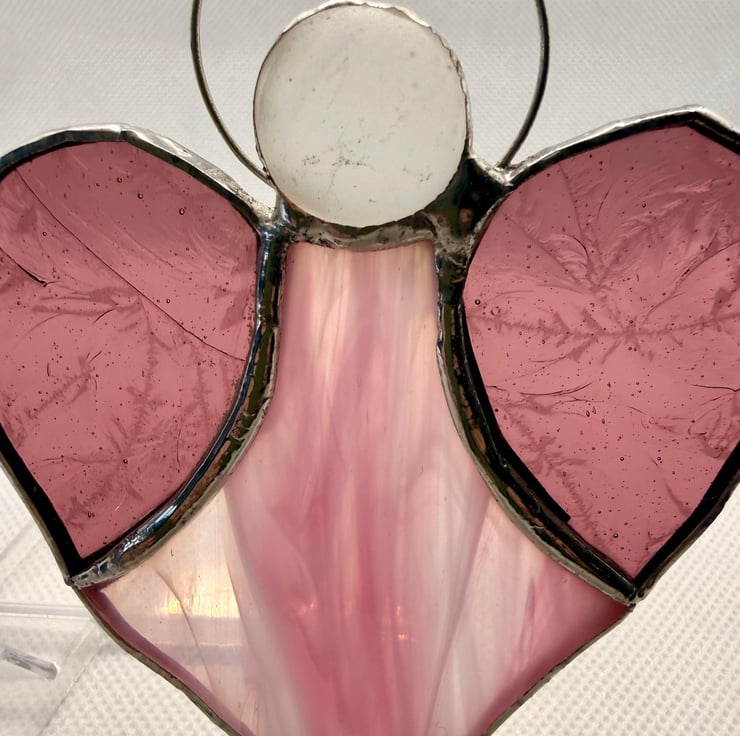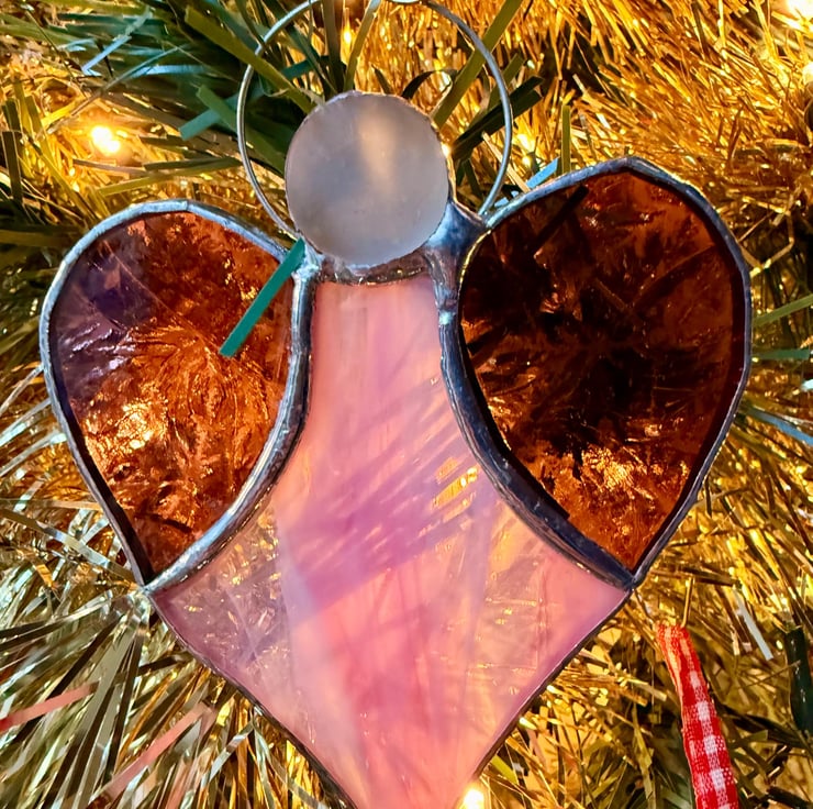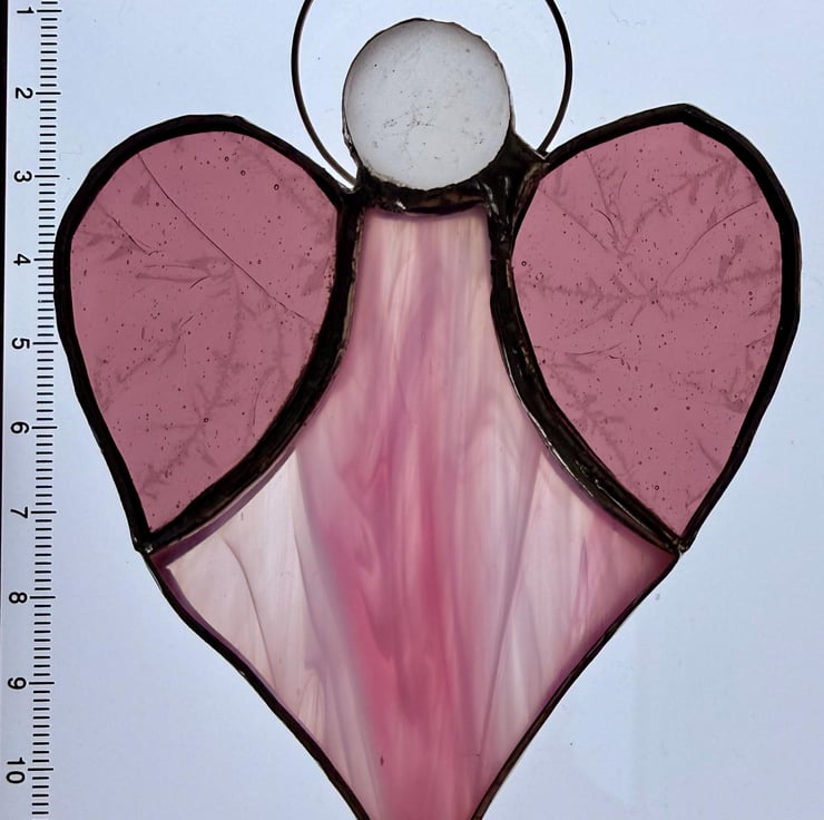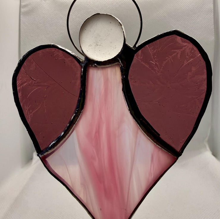 Each piece is individually hand cut, foiled, soldered and cleaned using the Tiffany method. Natural variations in craft glass make every angel unique, and colours may shift subtly depending on the light in your home.