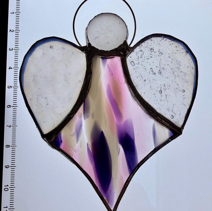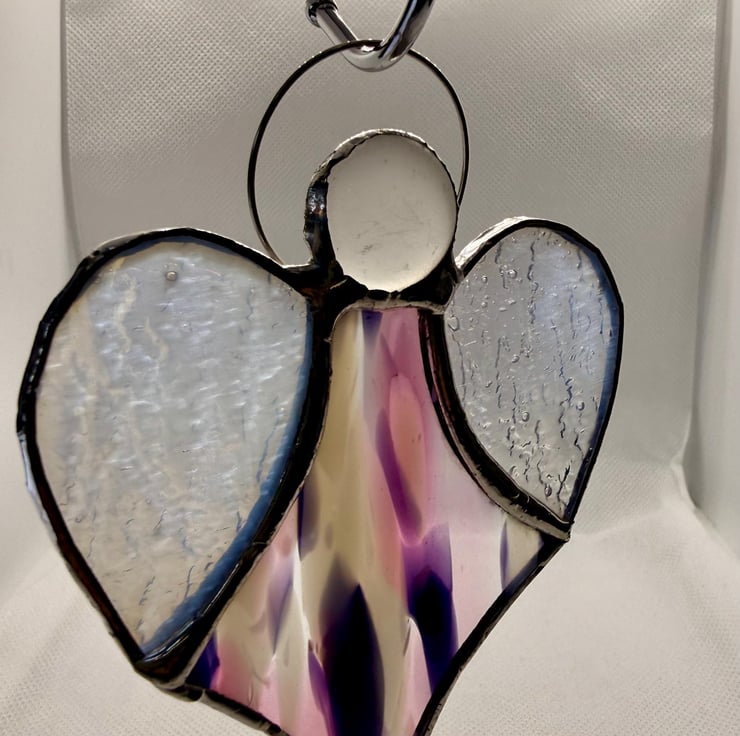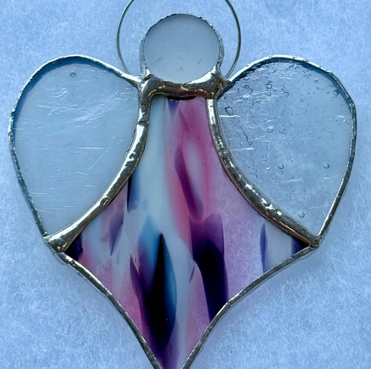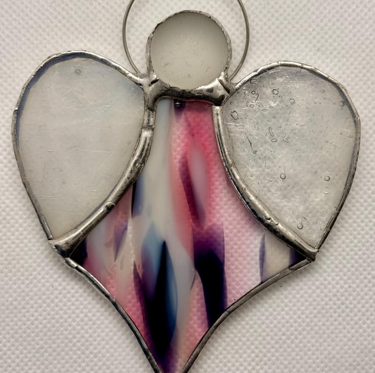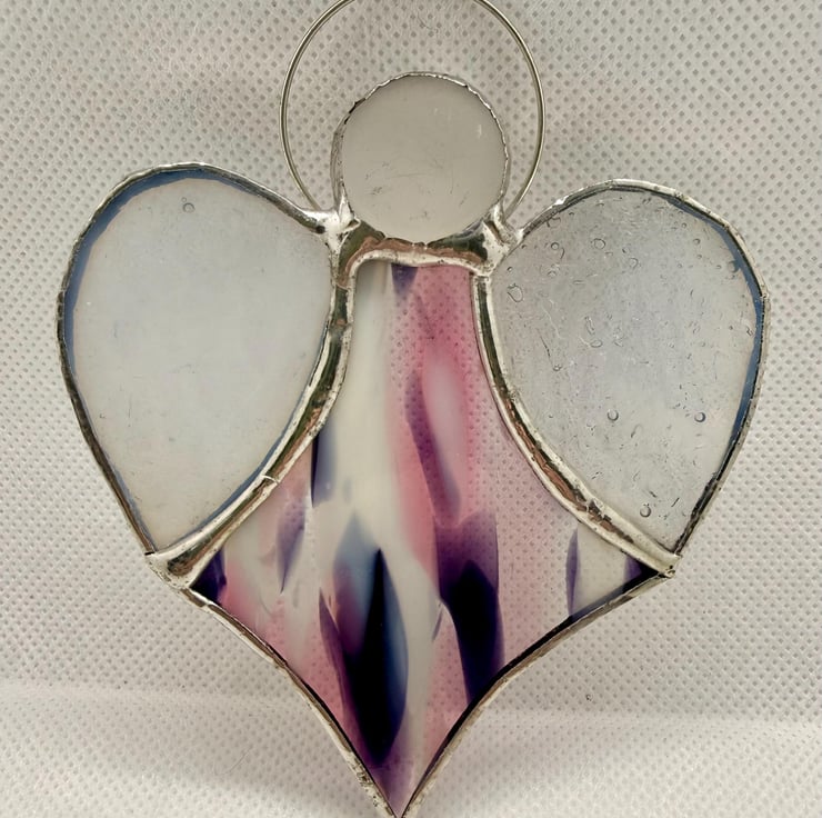 A stained glass heart angel made with Oceanside Spirit glass, blending soft splashes of pink, purple and white for the body, paired with textured translucent white wings and a misty white glass bead head.