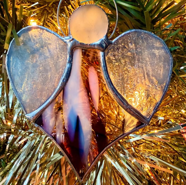 Each angel is mindfully made using the Tiffany foiled glass method: every piece is hand cut, foiled, soldered and cleaned. Natural variations in craft glass make every angel unique, and colours may change subtly depending on the light.
