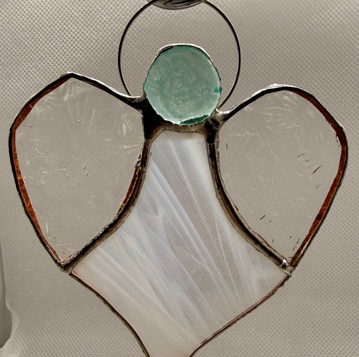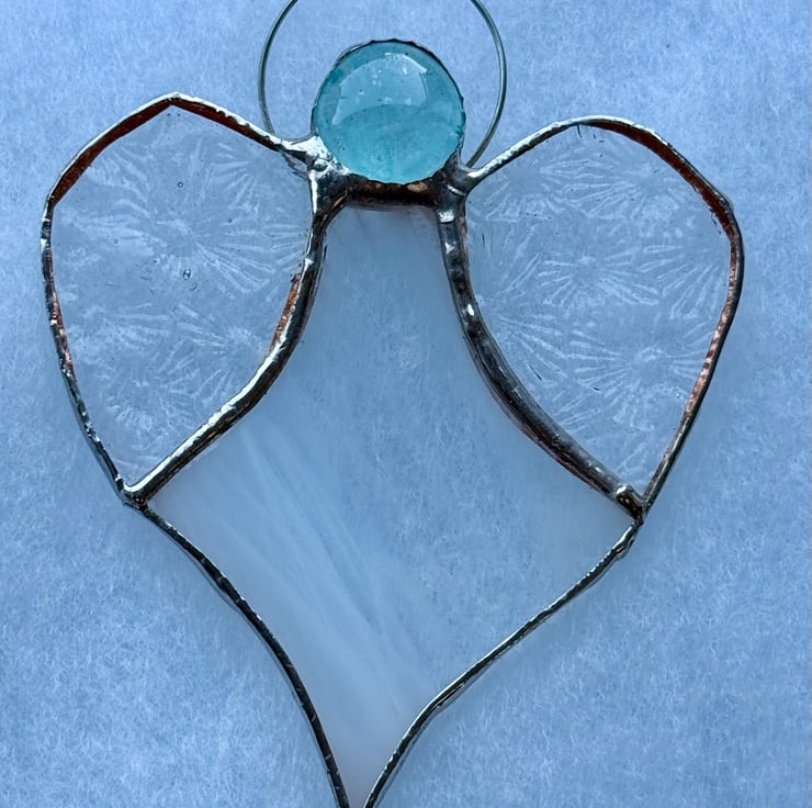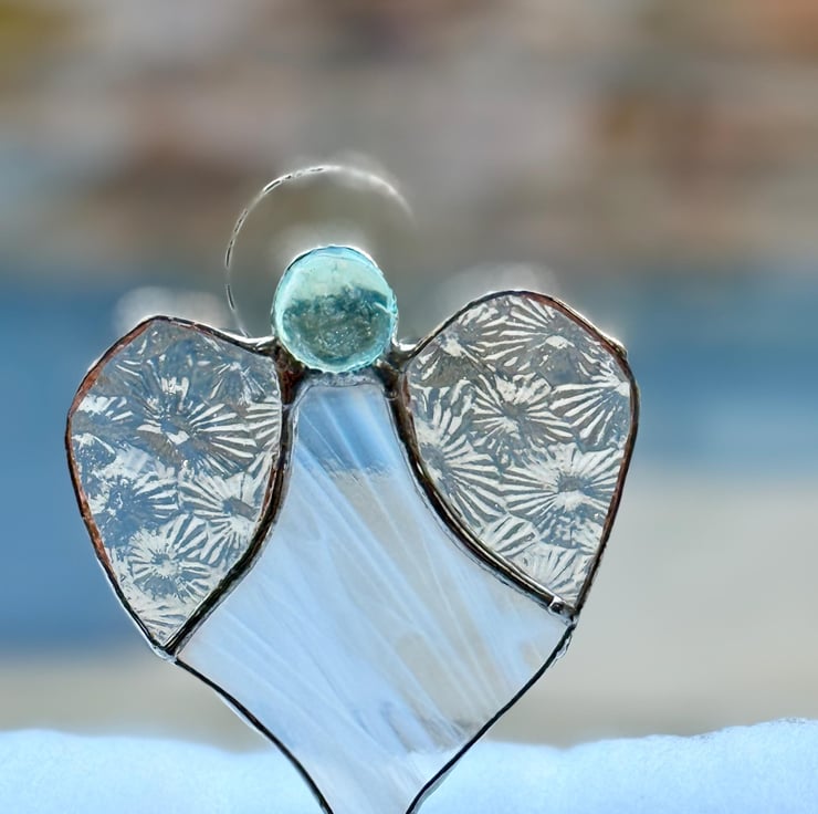 A stained glass heart angel made with a wispy white glass body and Florentine (flower) patterned translucent wings, topped with a pale turquoise glass bead head. The wings scatter the light with a soft, floral shimmer, while the white body glows gently throughout the day.