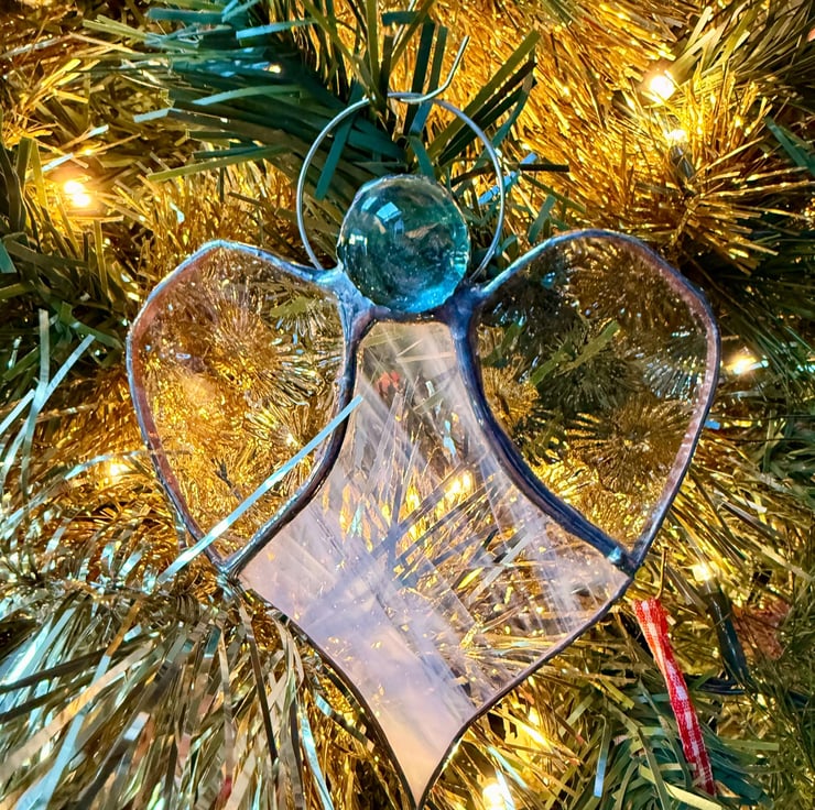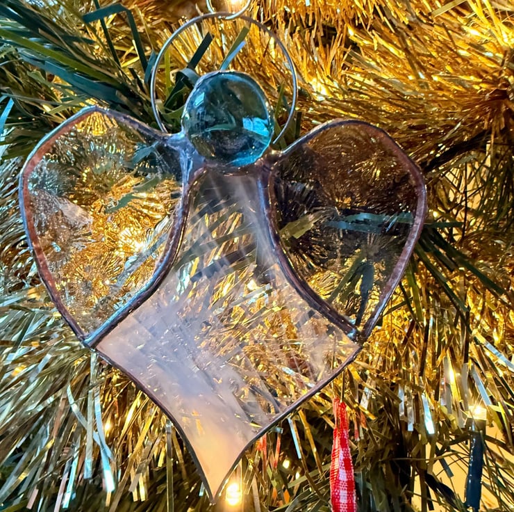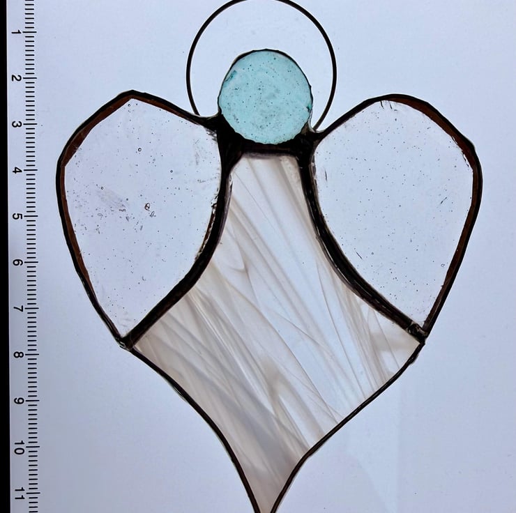 Each angel is mindfully made using the Tiffany foiled glass method: every piece is hand cut, foiled, soldered and cleaned. Natural variations in craft glass make every angel unique, and colours may shift subtly depending on the light.