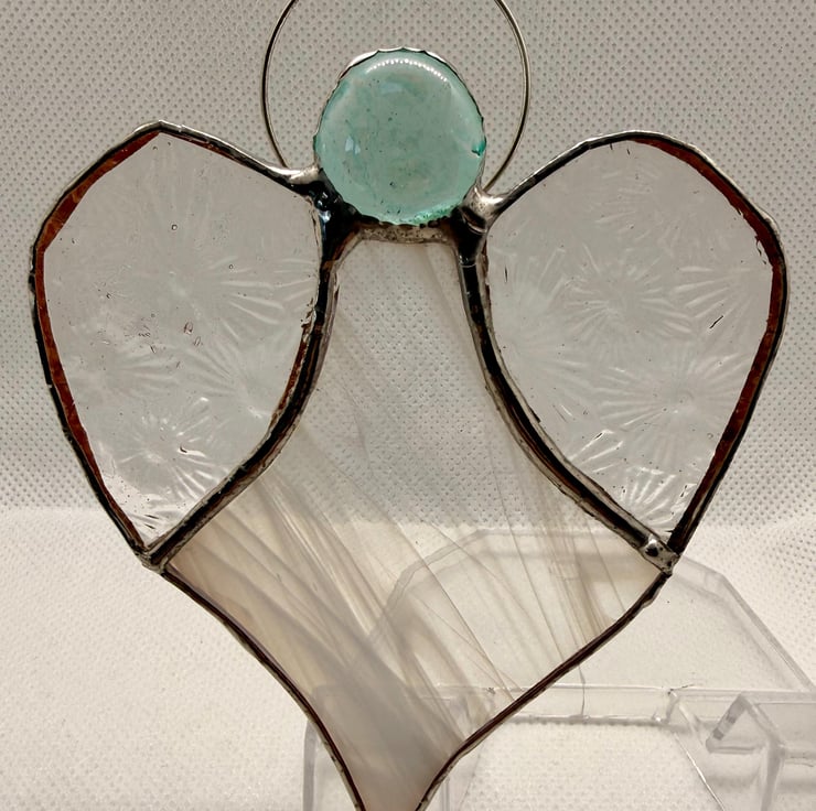 Hung from its halo, this angel brings a calm, uplifting presence to any space. It looks beautiful in a sunny window, adds a peaceful touch to a bedside or reading nook, and makes a thoughtful gift for new homes, birthdays, remembrance moments or anyone who loves handmade stained glass.