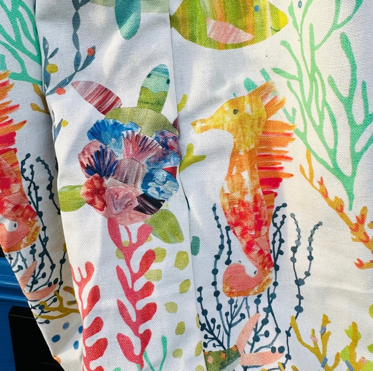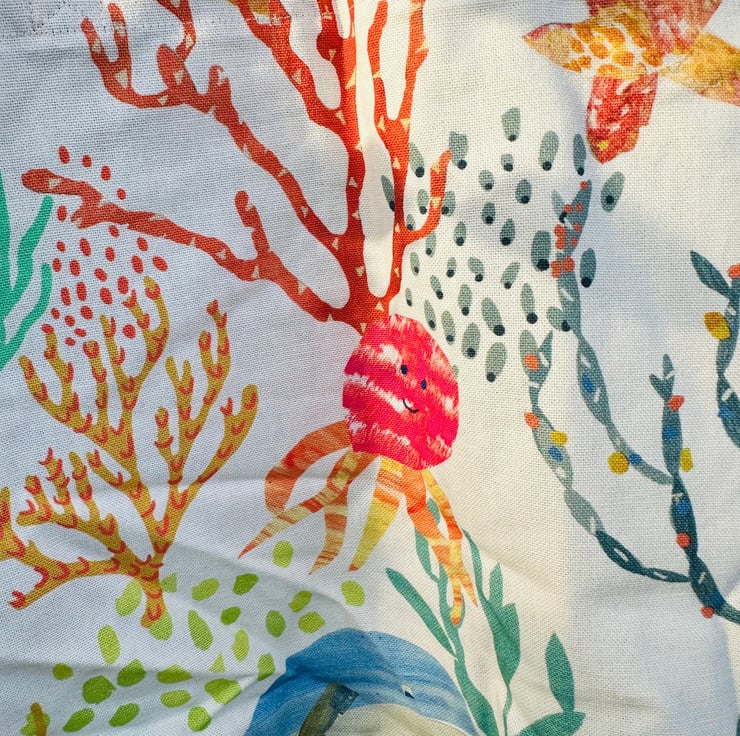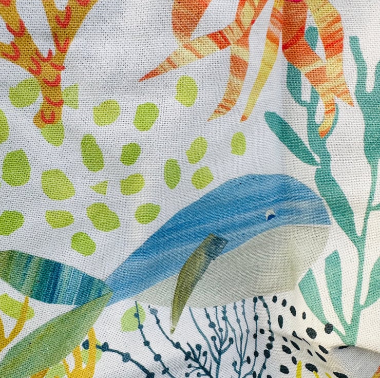 This bag began with my love of strong, characterful fabrics — the kind that feel good in the hand and bring a little joy to everyday tasks. The marine animals print has a playful, coastal feel, and pairing it with a deep blue lining gives the whole piece a sense of calm and depth.