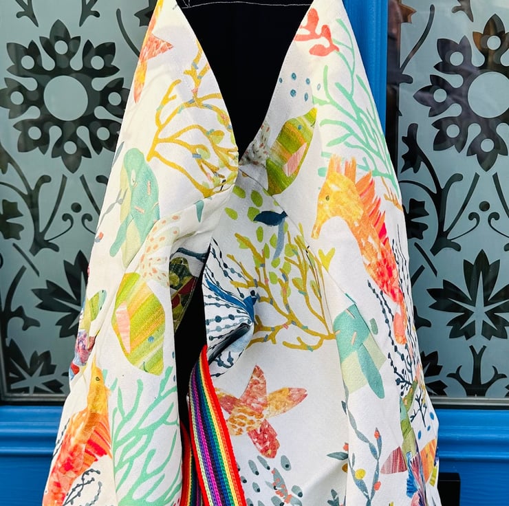 This large handmade tote bag is sewn from strong upholstery weight cotton printed with a lively collection of marine animals. The inside is lined with a deep blue cotton that gives the bag a neat and colourful finish. It is a practical and dependable bag that works well for shopping trips, days out or carrying books and everyday essentials.