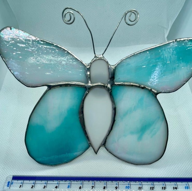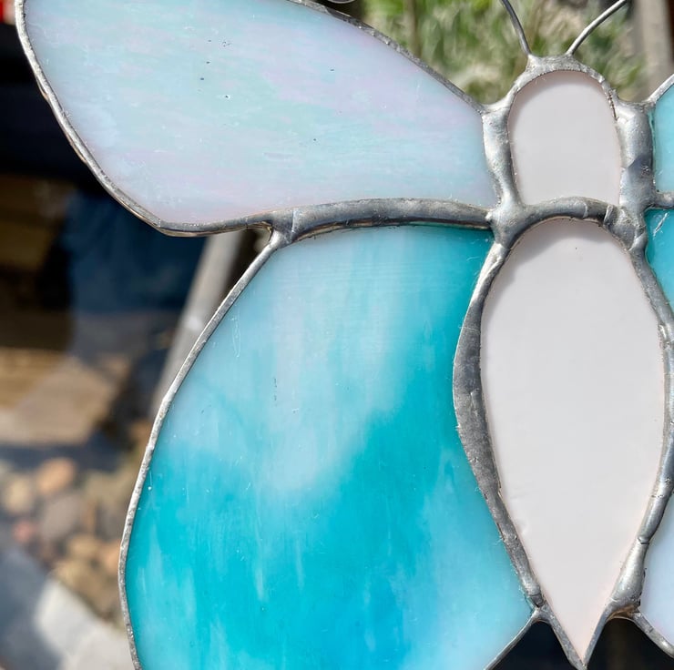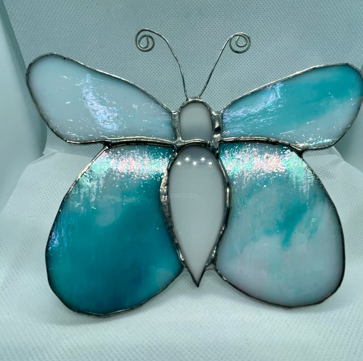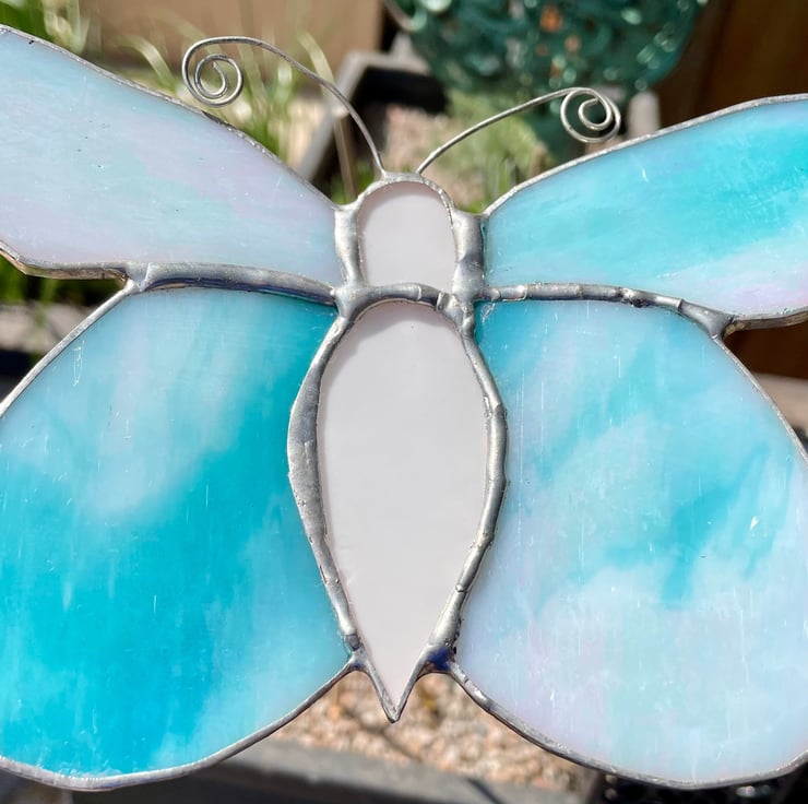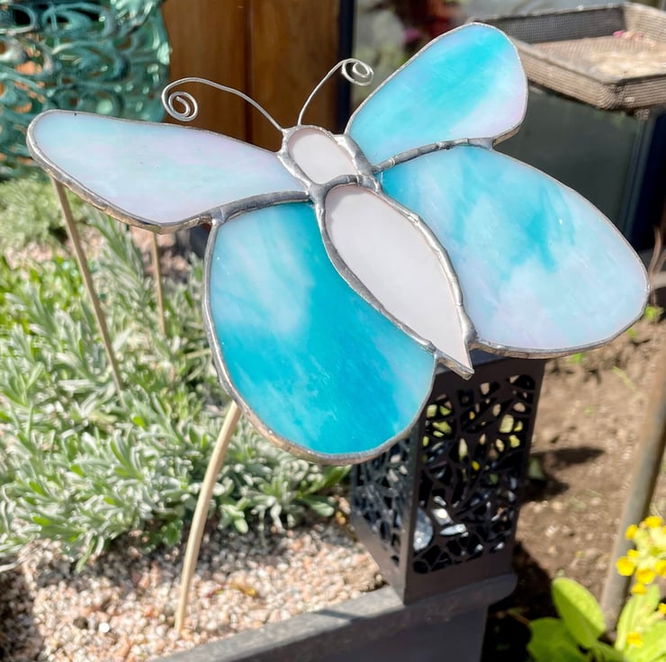 This stained glass butterfly is made from shimmering turquoise glass with soft white opaque areas that catch and reflect the light beautifully. It can be displayed on a garden stake of suitable strength, allowing the wings to glow in natural daylight.