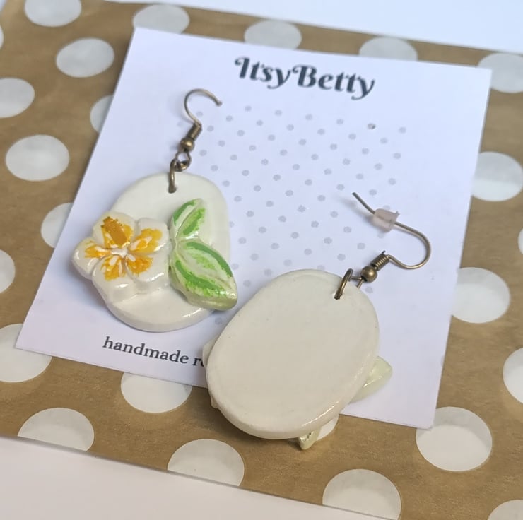 These earrings are crafted from air dry clay, hand painted and varnished to give a ceramic-like finish. Completed with hypoallergenic antique bronze effect ear wires and plastic backs.
