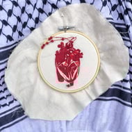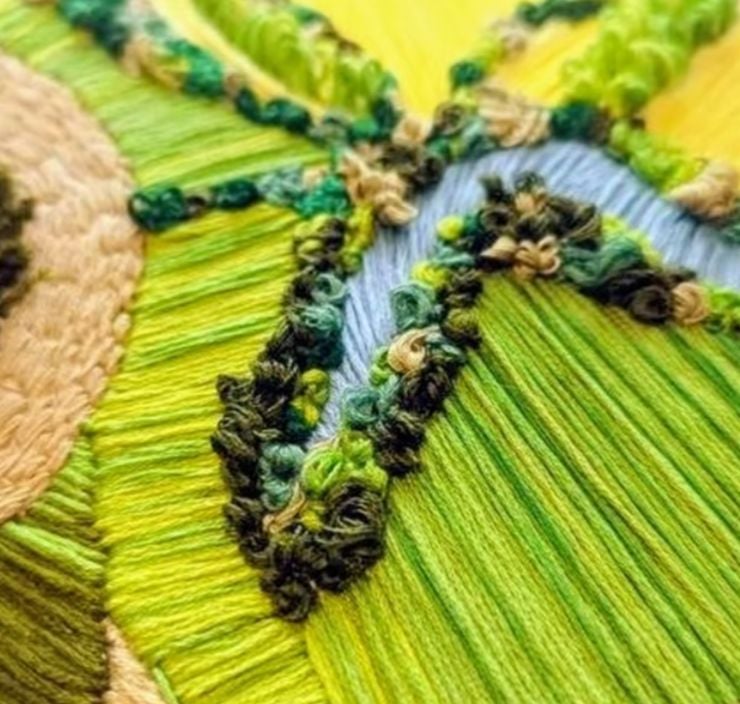 This is a vibrant medium sized hand embroidery of a farm from my imagination, with a blue stream coming to an end and bright mustard fields layed soft, grass and bushes twirling all around