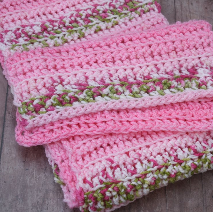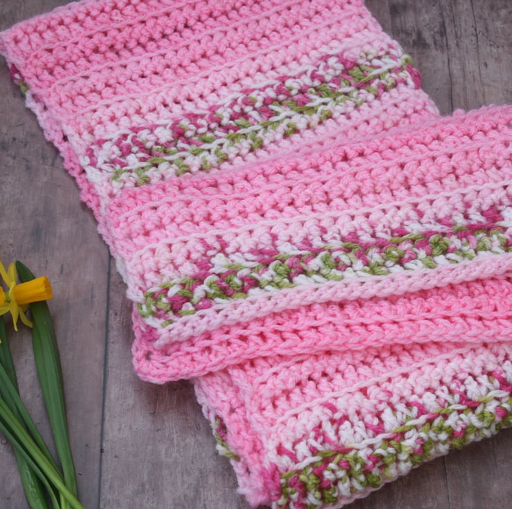 A really pretty and soft crocheted scarf, ideal for springtime over a blouse, shirt or jumper. The very pretty and intricate pattern offers a detailed and pretty scarf. The scarf would also be suitable for an older child. It is made from 70% Acrylic and 30% Nylon. Made with kind permission of the original pattern designer. Machine washable and care guidance will be sent with purchase.