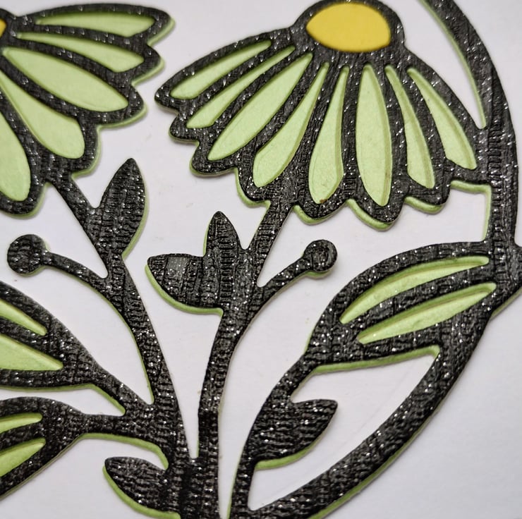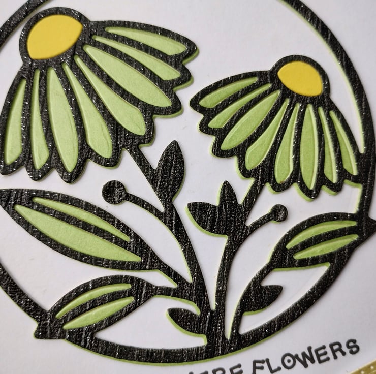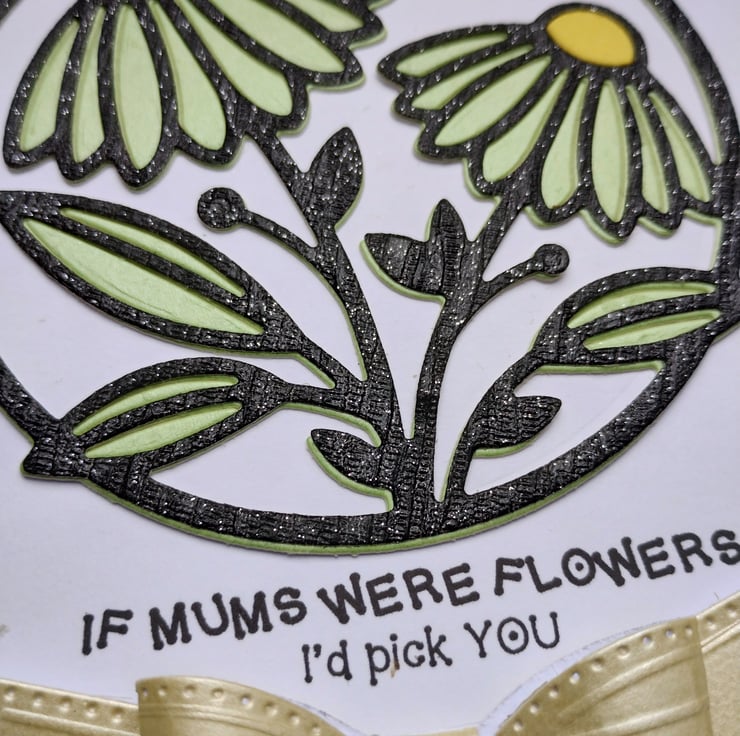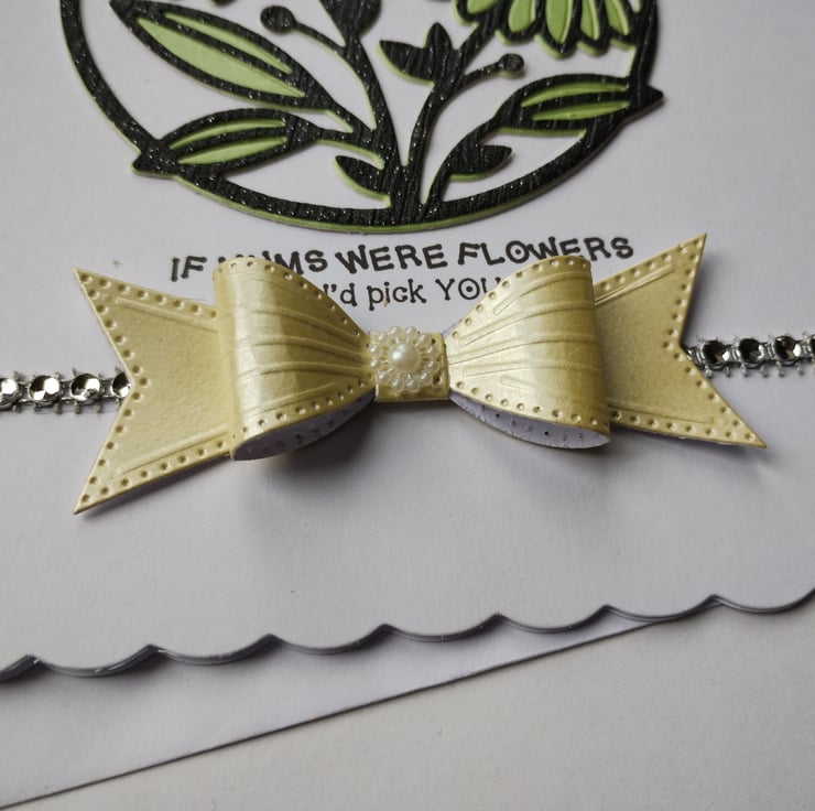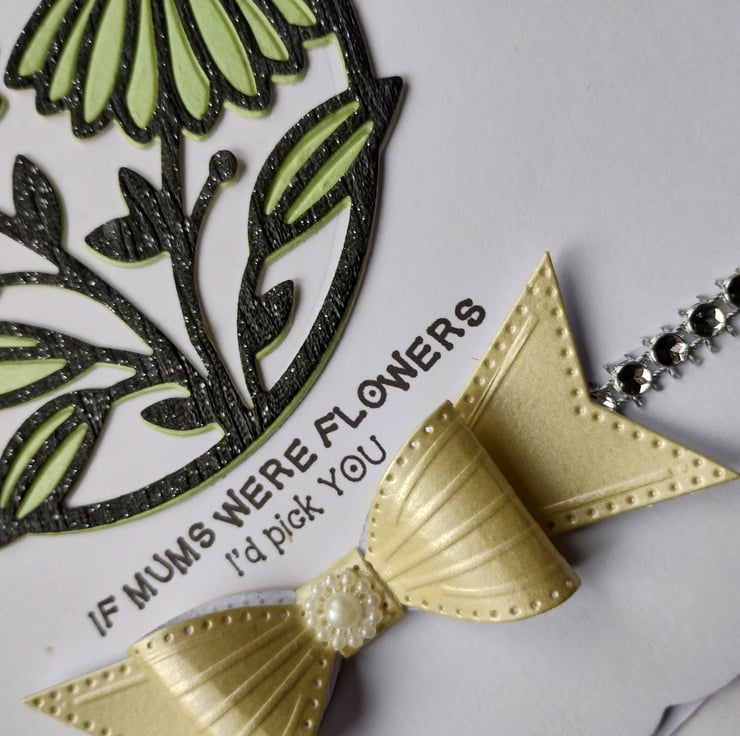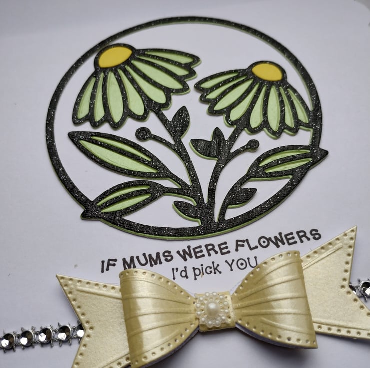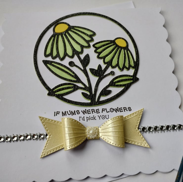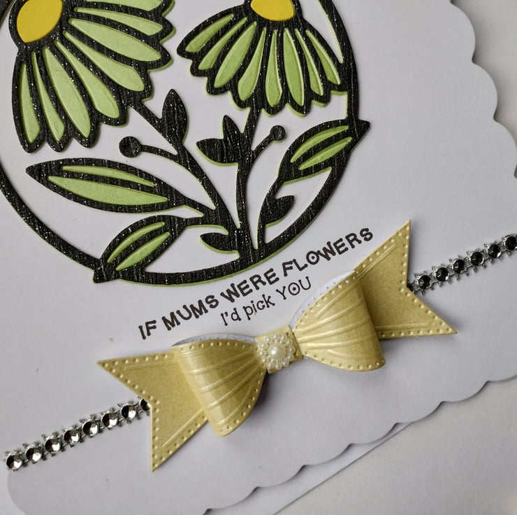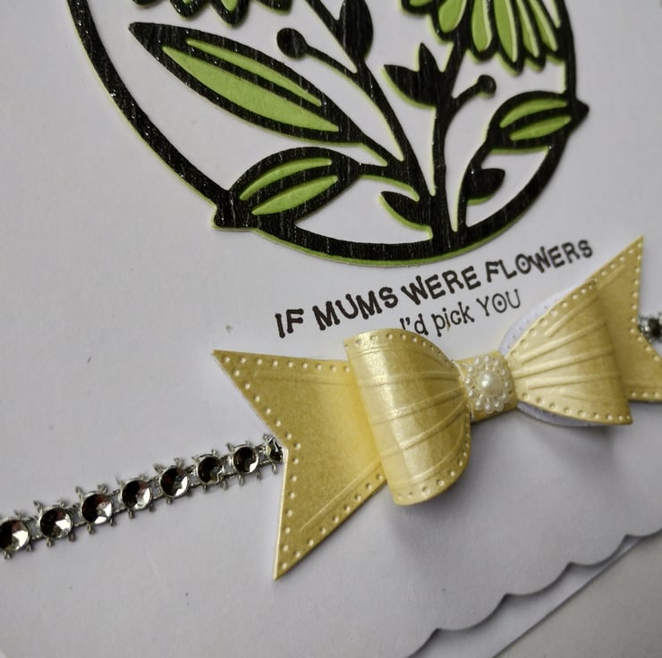 I've cut a circle of white card and added layers of green and shiny glittery black overlays in a beautiful gerbera image. I've added a strip of diamante style gems and a gorgeous yellow pearl finish cardstock bow with a little 'flower' at the bottom.