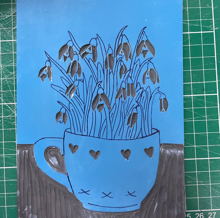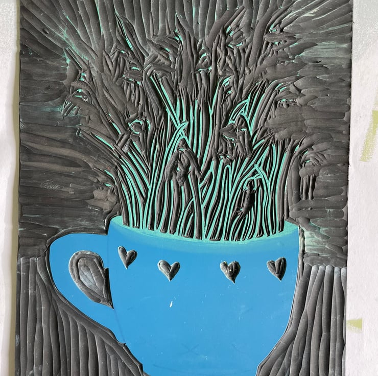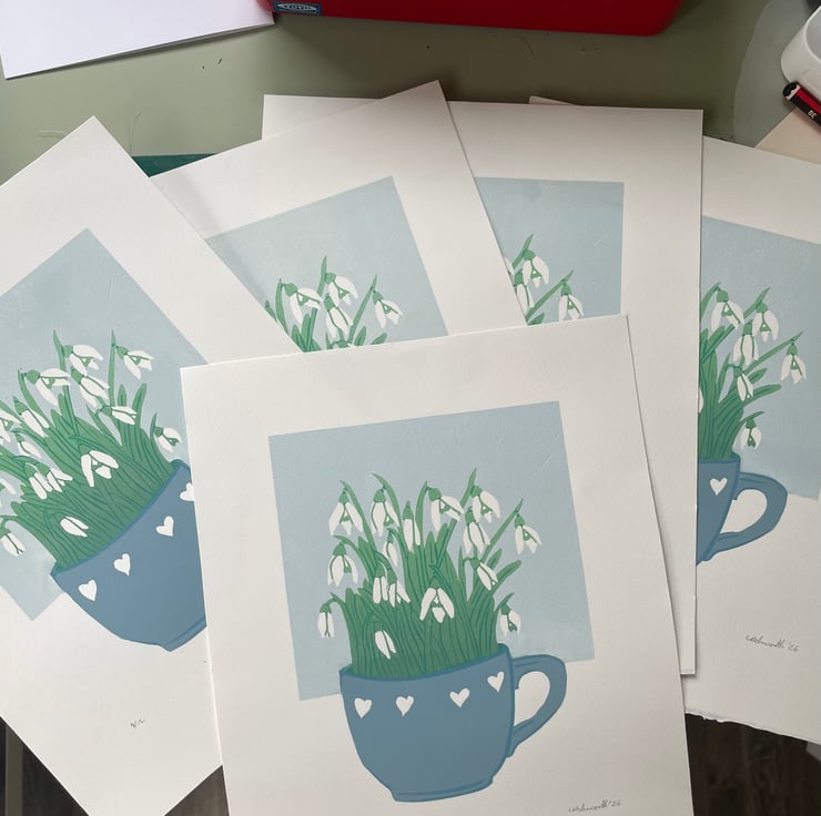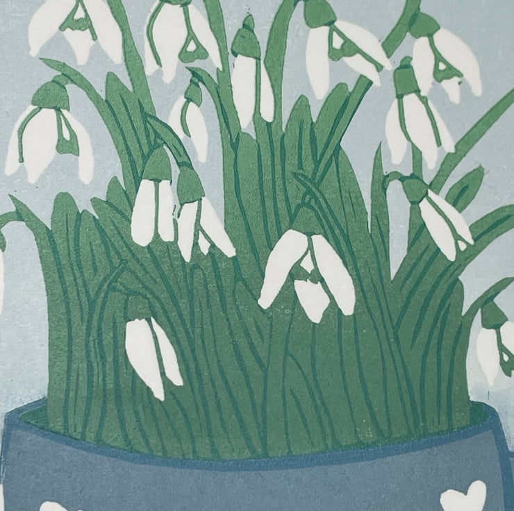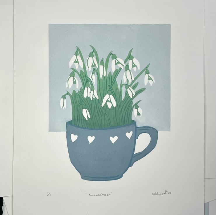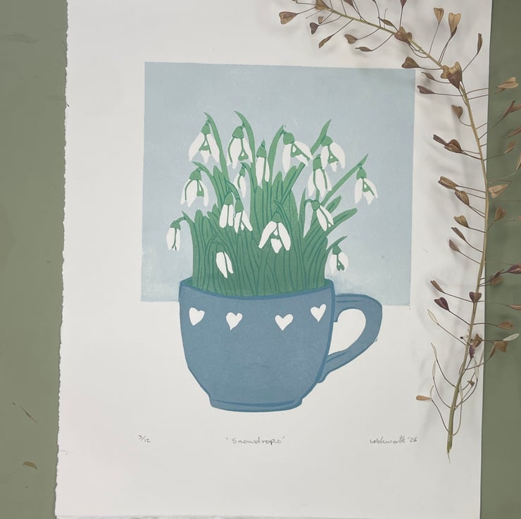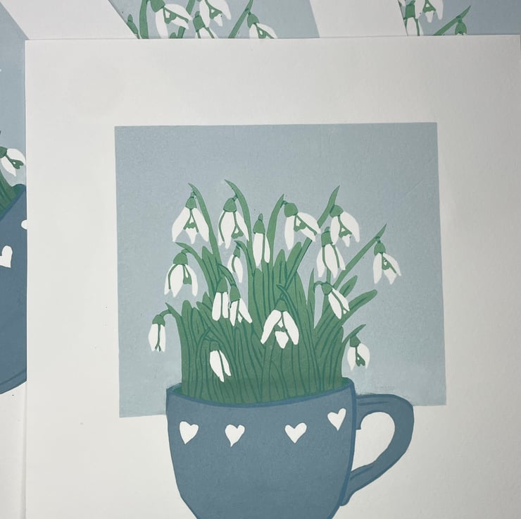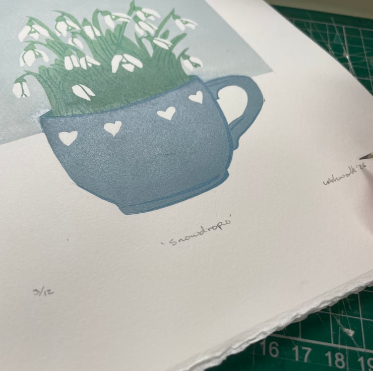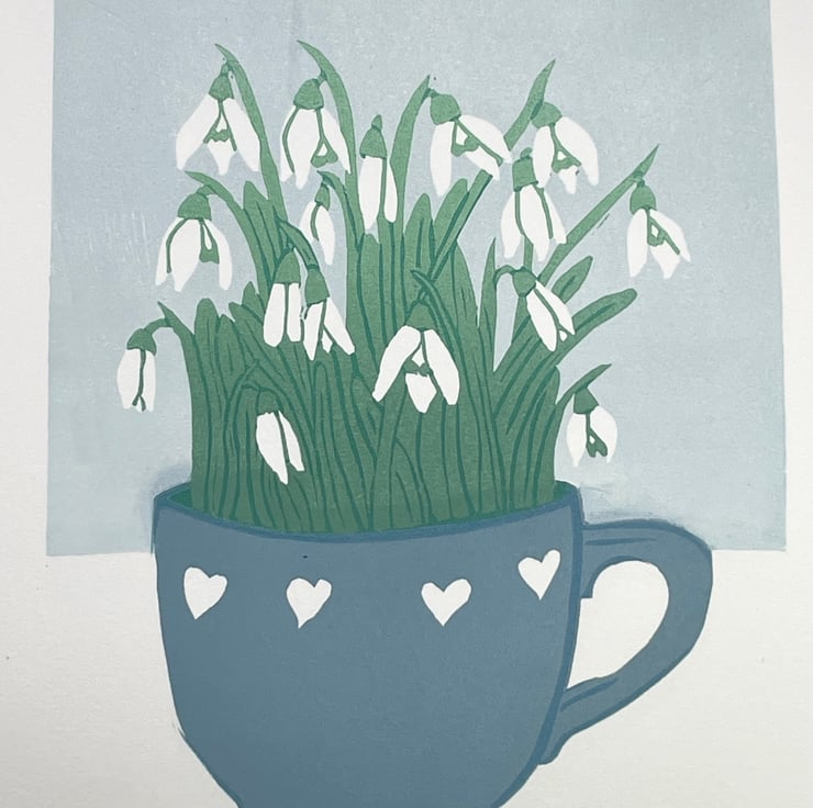 This print of snowdrops growing in a teacup ended up as a five layer reduction print with two layers involving colour gradients of ink. As it is a reduction print the process has involved destroying the block as I carve away more for each layer, therefore it cannot be repeated and there is a total of 12 prints in this edition.
