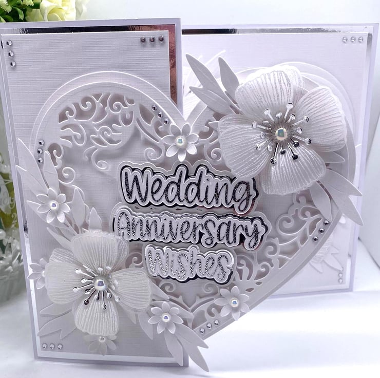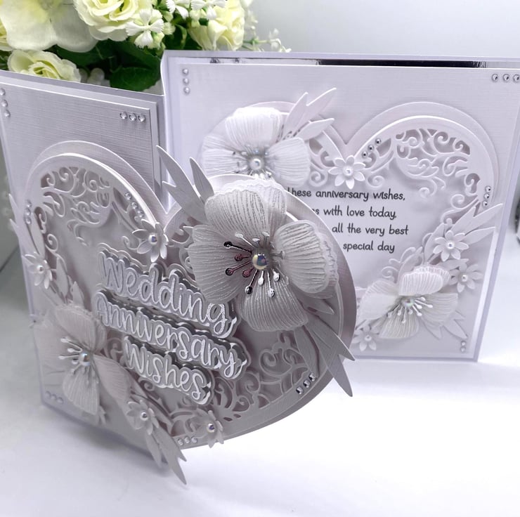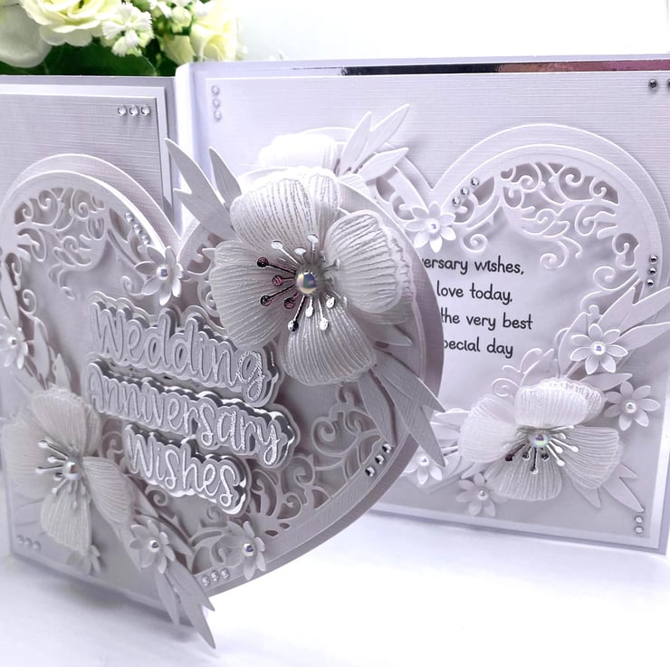 Both hearts have been die cut and layered up to give it the 3D look. You have the choice of adding names to the card, and there is a section where you can do this (at no extra cost) they will also be silver and white. The wording for the front 'Wedding Anniversary Wishes' comes in two similar fonts (style of writing) but with all my makes, you will always get the best quality and make each time.